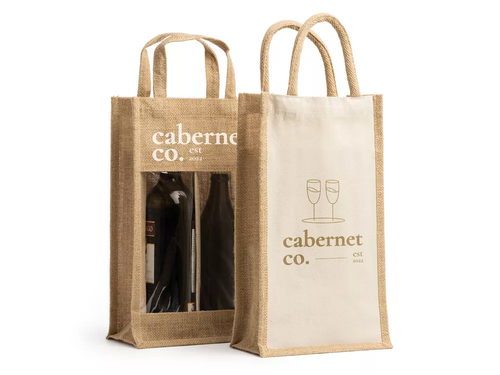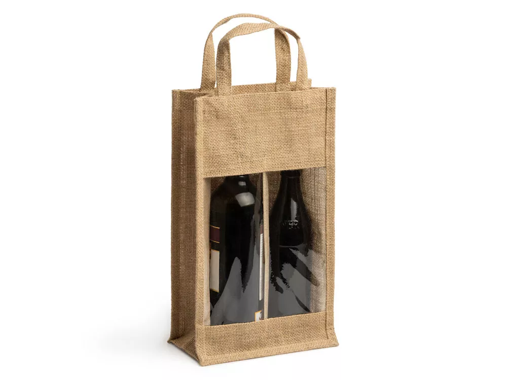 Сумка из ламинированного джута с окошком и двойным отделением. Идеально подходит для бутылок. Усиленные ручки.
