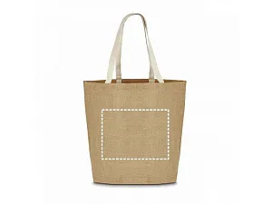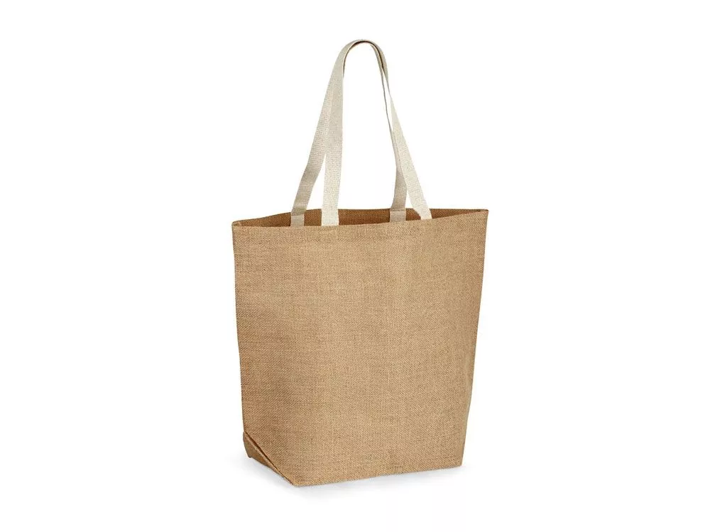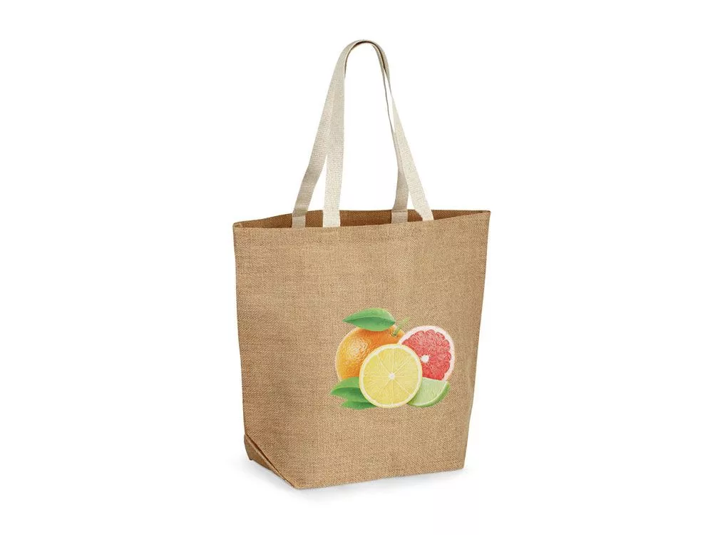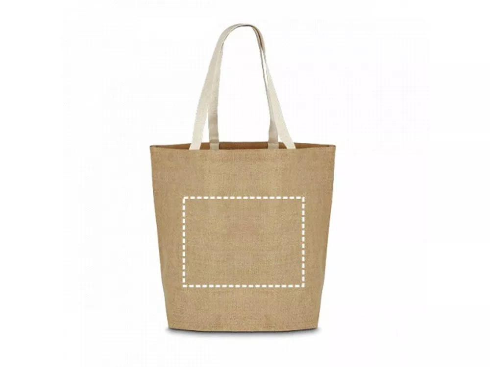 Джутовая сумка для покупок (360 г/м2) , ламинированная внутри, с ручками длиной 60 см. Вид нанесения, рекомендуемый поставщиком: трансфер
