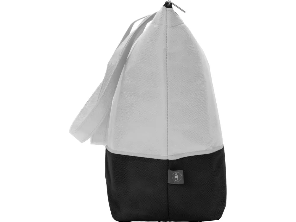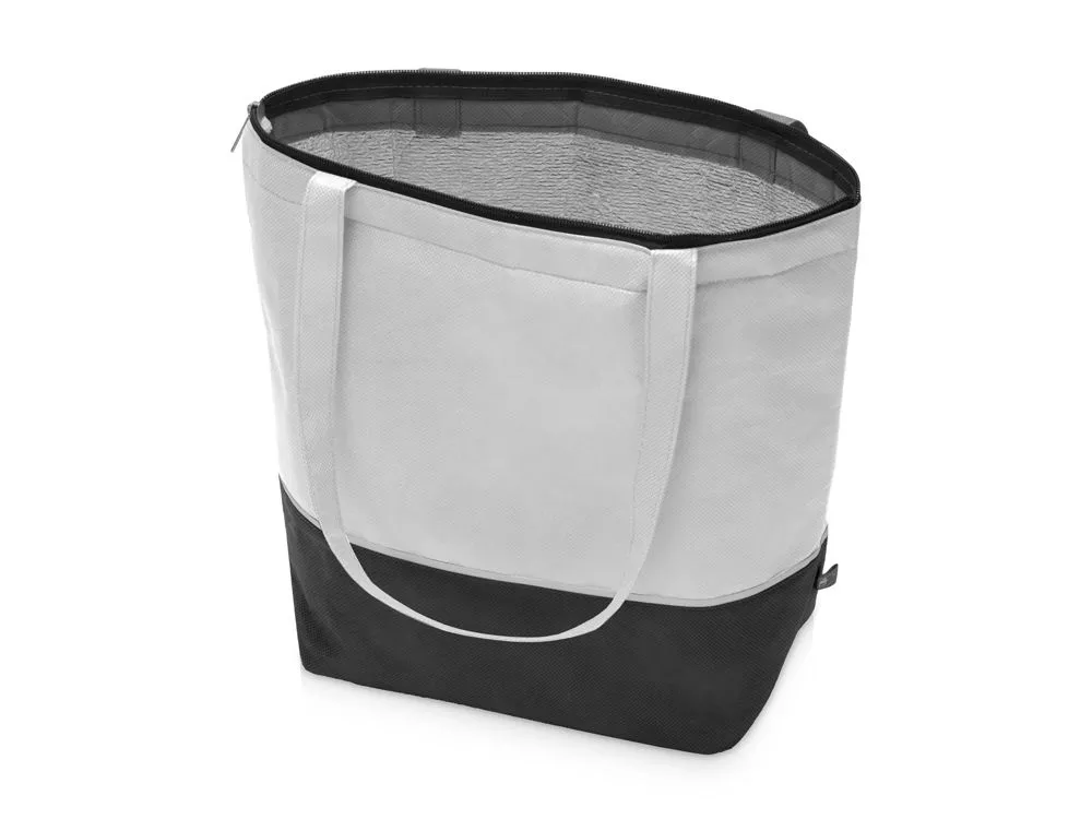 Вместительная сумка-холодильник из переработанного пластика. Удобные длинные ручки для ношения на плече. Застегивается на молнию. Термотрансфер (1 цвет (белые изделия)) на данный товар осуществляется бесплатно. Оплачивается только настройка оборудования в размере 5500 рублей на весь тираж.