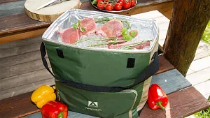 Классическая сумка-холодильник, с которой можно отправиться на пикник, на дачу или в дальнюю поездку. Эту модель отличает большой холодильный отсек и удобное окошко для быстрого доступа внутрь, благодаря которому увеличивается время сохранения продуктов холодными, ведь не надо лишний раз открывать крышку полностью.