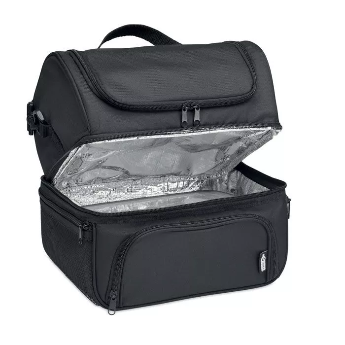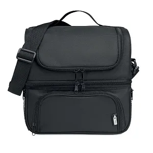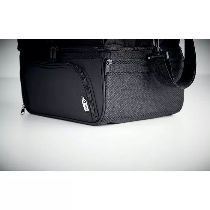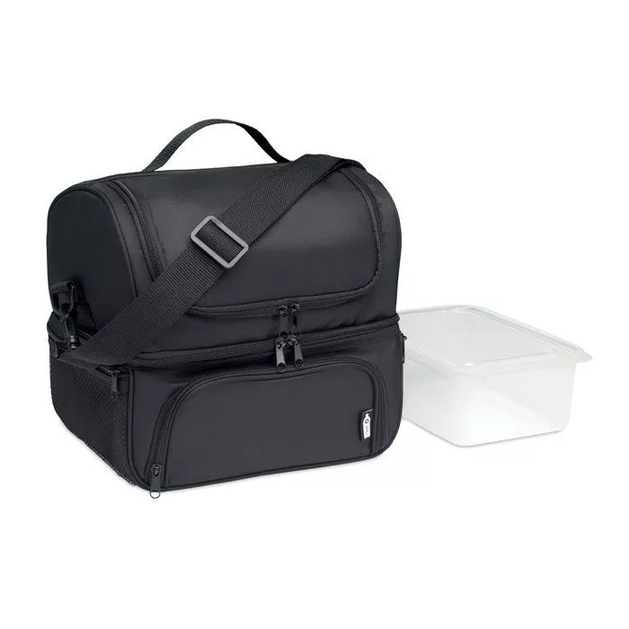 Термо сумка из 600D RPET с ланч боксом из полипропилена емкостью 1900 мл. Ланч бокс с 2 секциями. Регулируемый съемный плечевой ремень. Подкладка из алюминиевой фольги толщиной 2 мм.