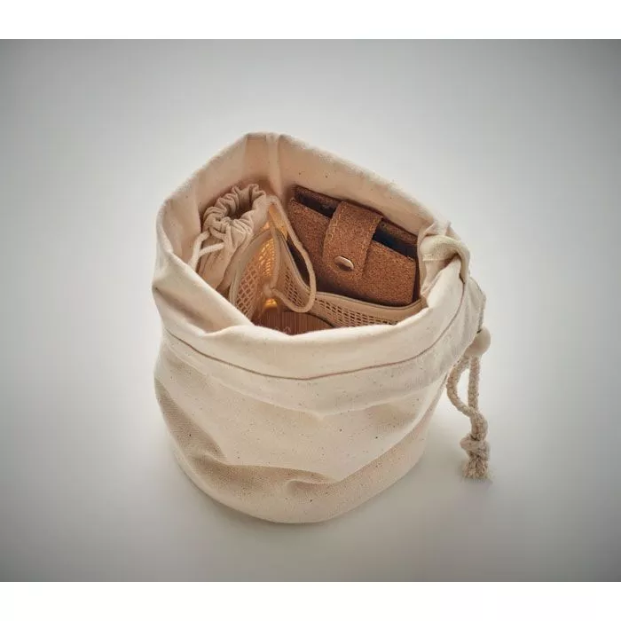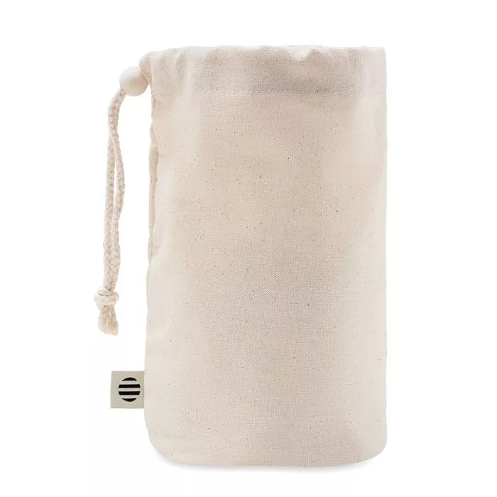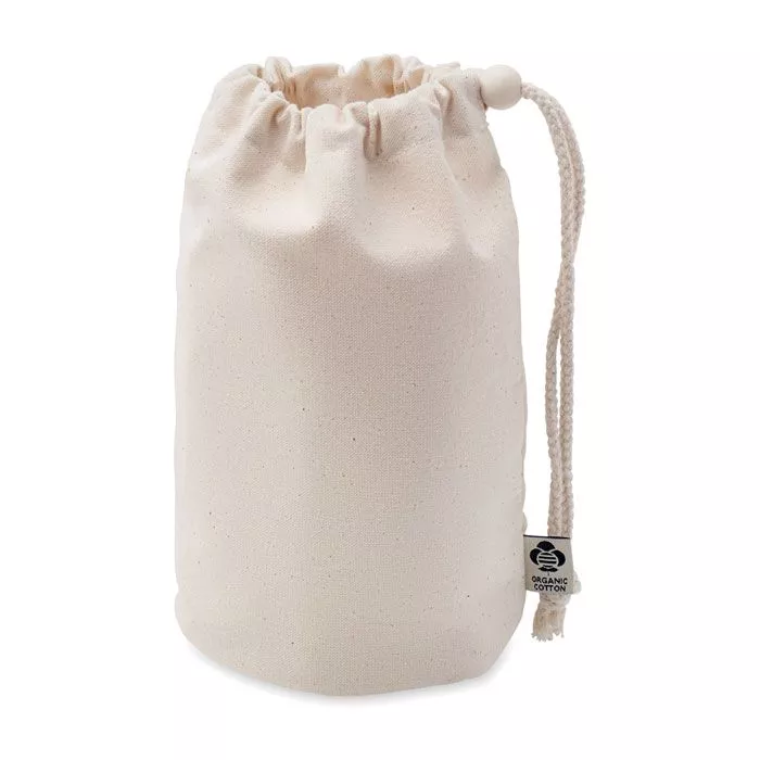 Небольшая сумка-мешок для аксессуаров из органического хлопка. 220 гр/м². Имеет внутренние сетчатые отделения и деревянную застежку.