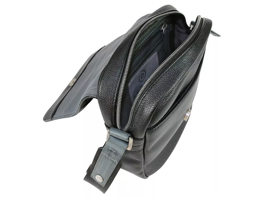 НАПЛЕЧНАЯ СУМКА MOTO D Наша линейка рюкзаков и сумок Moto D, произведённых из высококачественного полиуретана, выполнена в привлекательном винтажном стиле. Чёрный и синий цвета гармонично сочетаются с чёрными тканевыми ремнями и серой полиуретановой отделкой. Аутентичная нашивка Bugatti эффектно украшает переднюю часть изделий, в то время как двойные швы подчёркивают спортивный характер коллекции. В серию входят удобные элегантные наплечные сумки и стильные вместительные рюкзаки. СВОЙСТВА Внутренняя организация: основное отделение на молнии с карманом на молнии и карманом-органайзером Внешняя организация: переднее отделение, задний карман на молнии, регулируемый плечевой ремень (до 150 см) Размер: 18 x 6 x 25 см Объём: 2 л Вес: 0,43 кг Материал: полиуретан