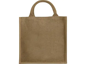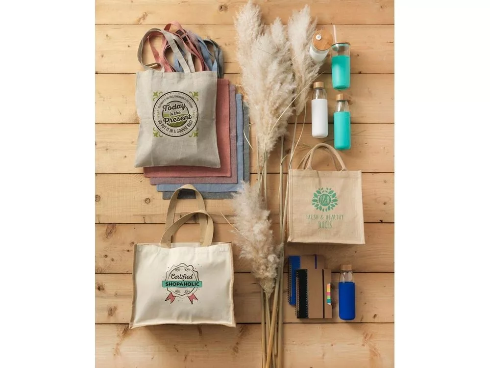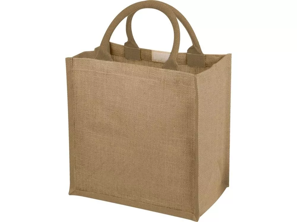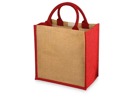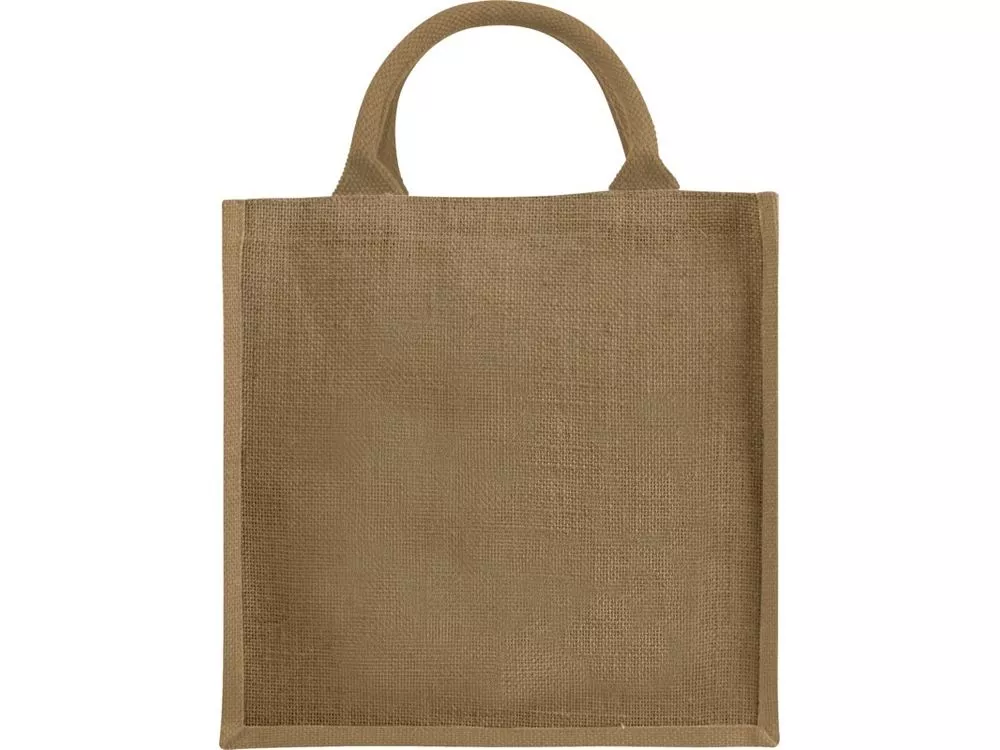 Джутовая подарочная сумка с ламинированным открытым основным отделением, которое застегивается на липучку. Хлопковые ручки высотой 11,5 см. Термотрансфер (1 цвет (цветные изделия)) на данный товар осуществляется бесплатно. Оплачивается только настройка оборудования в размере 9200 рублей на весь тираж.