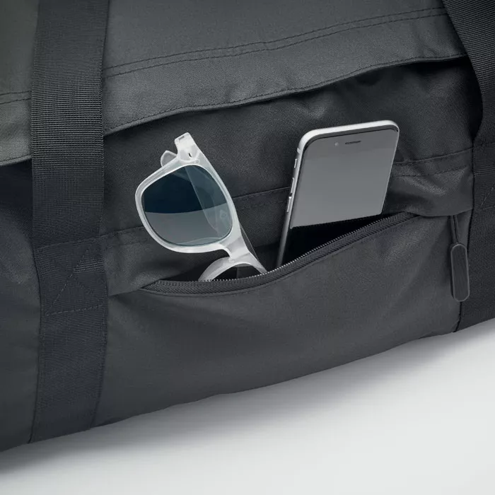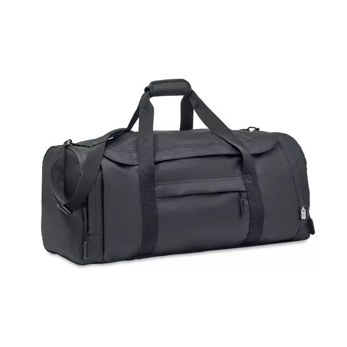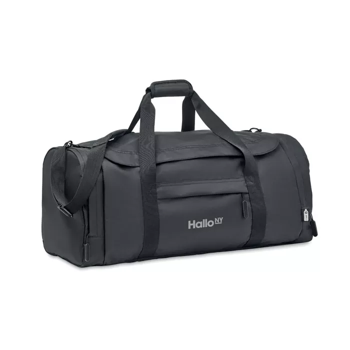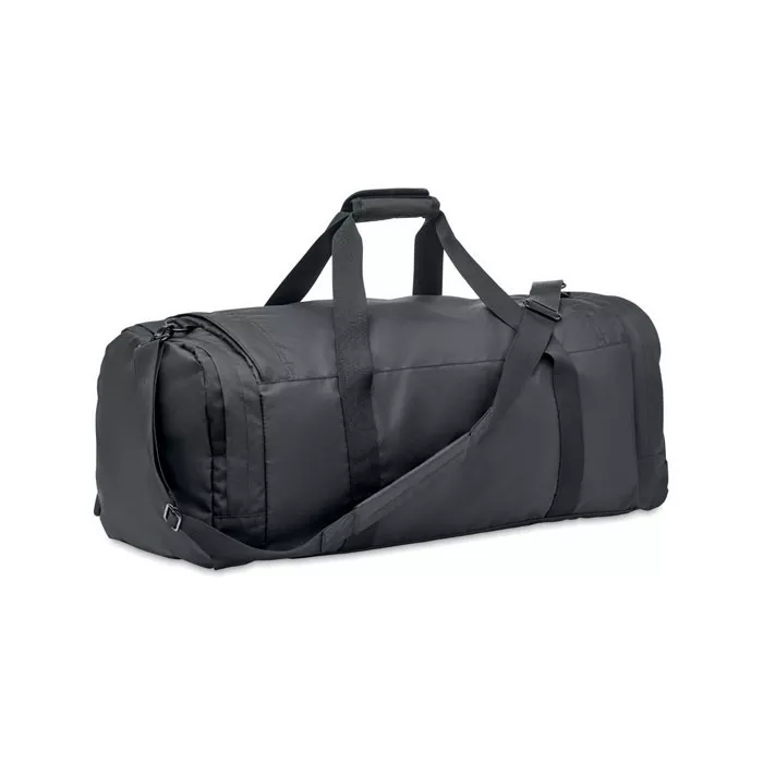 Большая спортивная или дорожная сумка из полиэстера 300D RPET. Основное отделение с боковым термо карманом на молнии. Съемная усиленная нижняя часть и регулируемый съемный плечевой ремень.