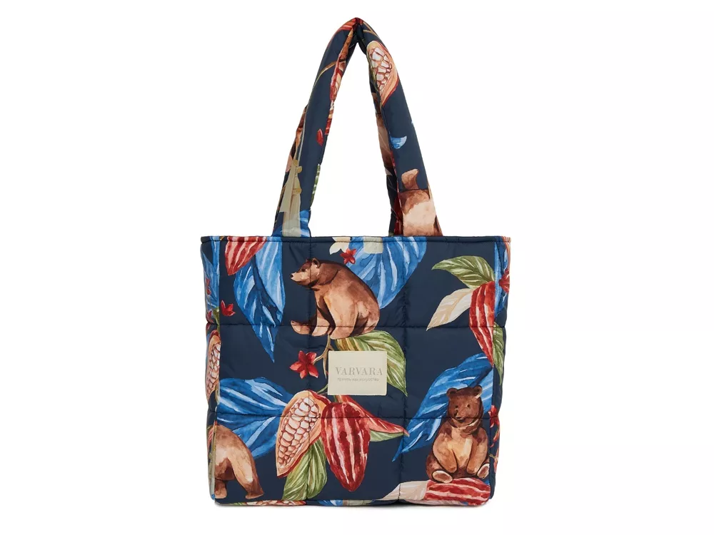 Стеганая сумка-шоппер с принтом ‘Мишки в шоколаде’ от российского бренда Varvara. Вместительный аксессуар, оптимально подходит под формат A4. Внутри имеется карман для мелочей. Принт Мишки в шоколаде продолжает серию сказочных принтов Varvara. Задорные медвежата прячутся в листьях и плодах вечнозеленого какао, создавая яркий, эмоциональный узор. Сумка упакована в подарочную коробку. Бережный уход: - Ручная стирка при температуре не выше 30 градусов. - Сушка в горизонтальном положении. * фрагмент принта может отличаться от представленного на фото