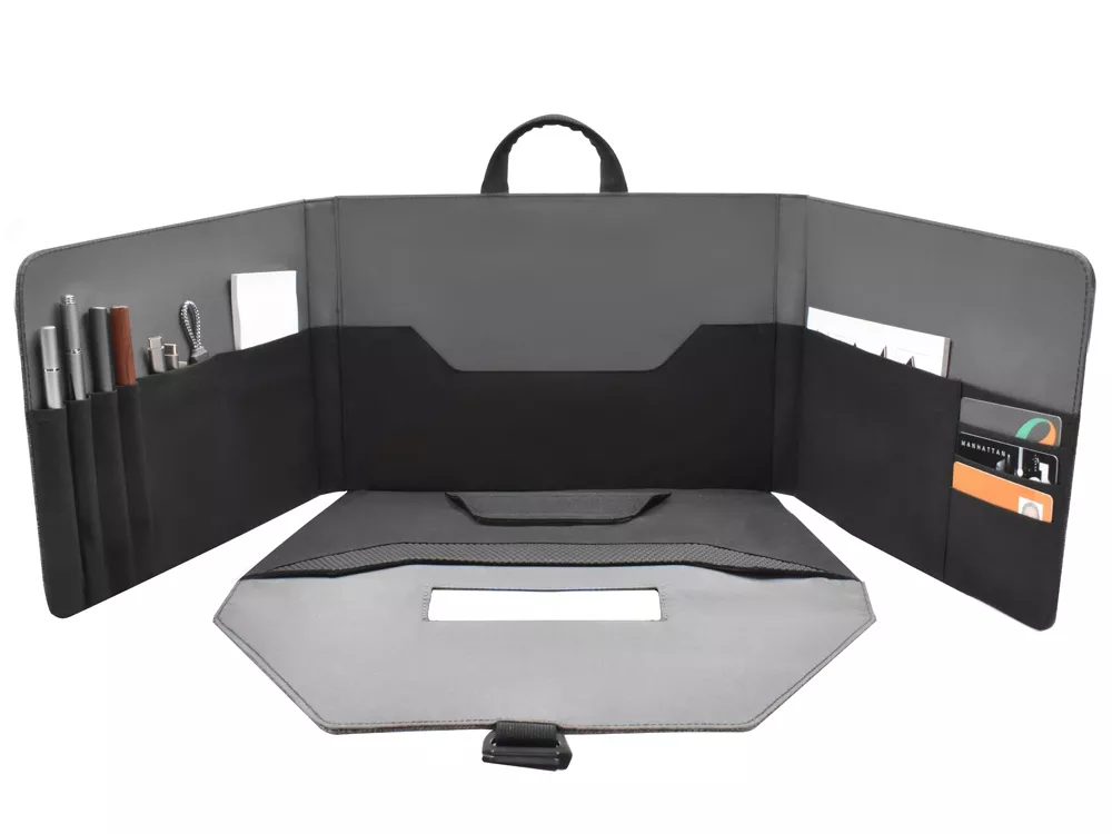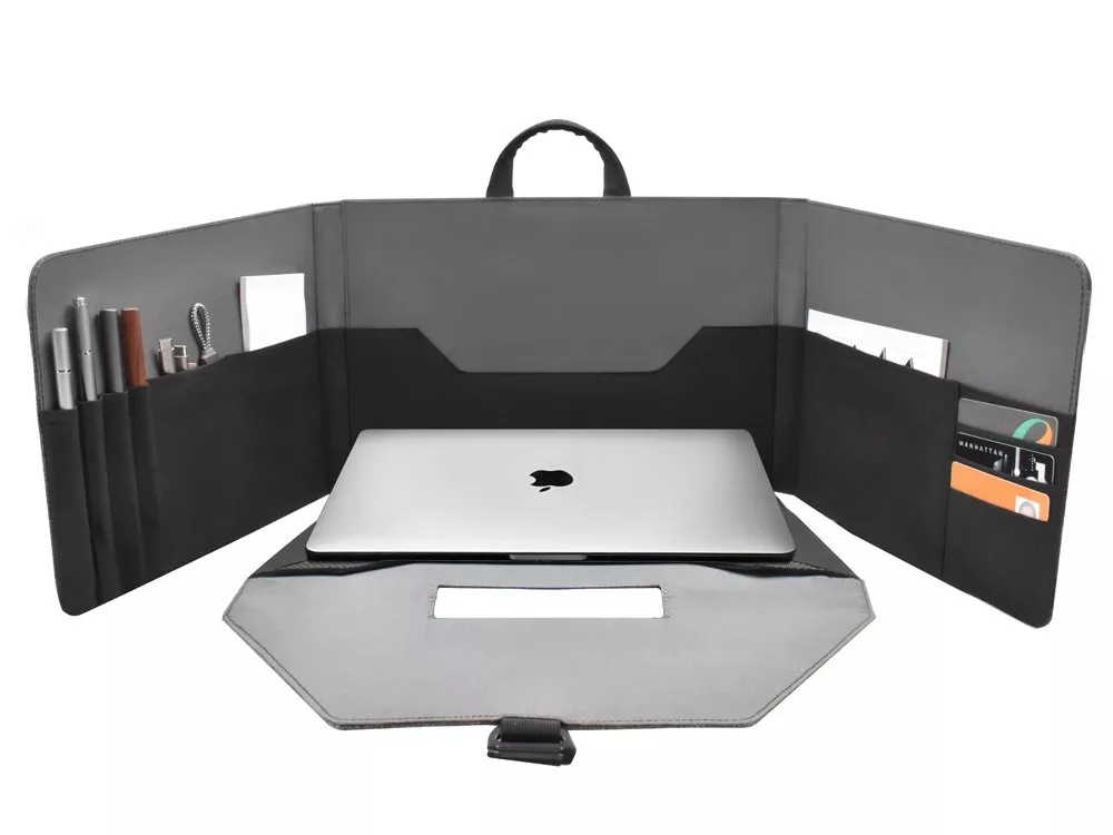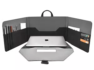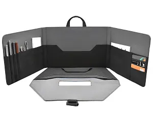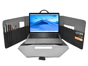 Легкая и функциональная сумка для ноутбука15'' или планшета, которая быстро трансформируется в комфортабельное переносное рабочее место. Степень наклона ноутбука при работе регулируется липучкой. Внутри предусмотрен органайзер для канцтоваров, смартфона, бумажника и карточек. Застежка надежно фиксирует сумку на закрытом виде. Вы сможете работать в любом месте и любой обстановке. Термотрансфер (1 цвет (цветные изделия)) на данный товар осуществляется бесплатно. Оплачивается только настройка оборудования в размере 5400 рублей на весь тираж.