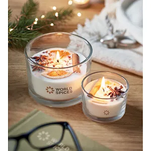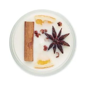 Небольшая восковая свеча на растительной основе с ароматом корицы и цитрусовых, с засушенными цветами и фруктами в стеклянном стаканчике. 85 гр. Время горения: 14 часов.