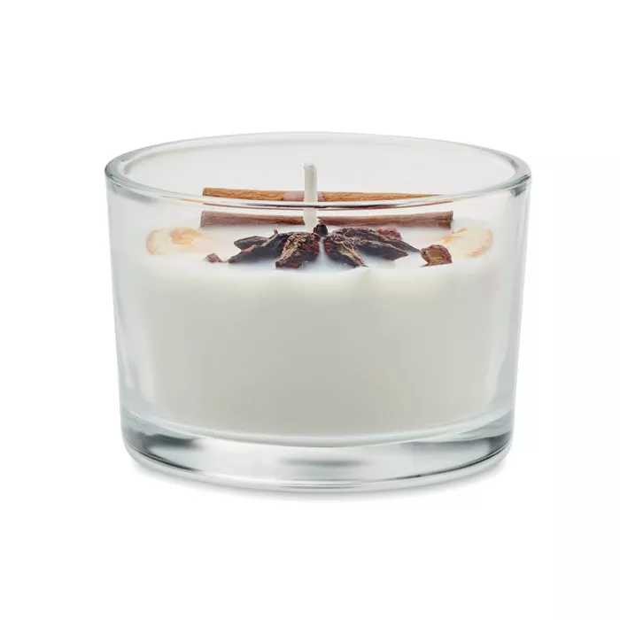 Небольшая восковая свеча на растительной основе с ароматом корицы и цитрусовых, с засушенными цветами и фруктами в стеклянном стаканчике. 85 гр. Время горения: 14 часов.