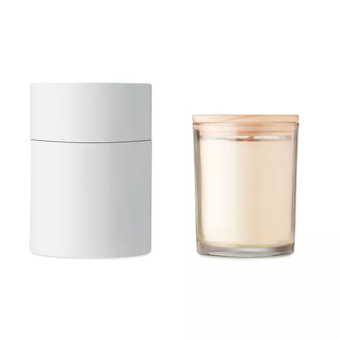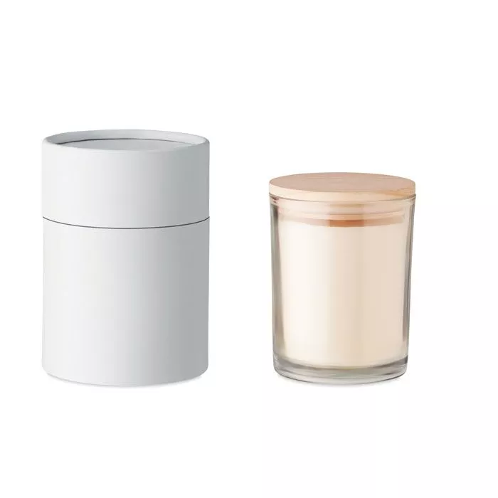 Восковая свеча с ароматом ванили в стаканчике с бамбуковой крышкой в подарочной тубе из бумаги. Диаметр 8 см.