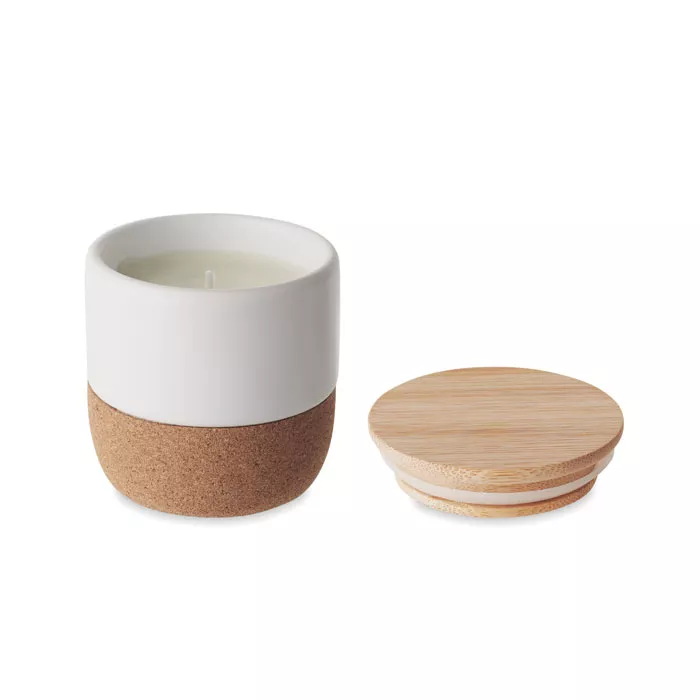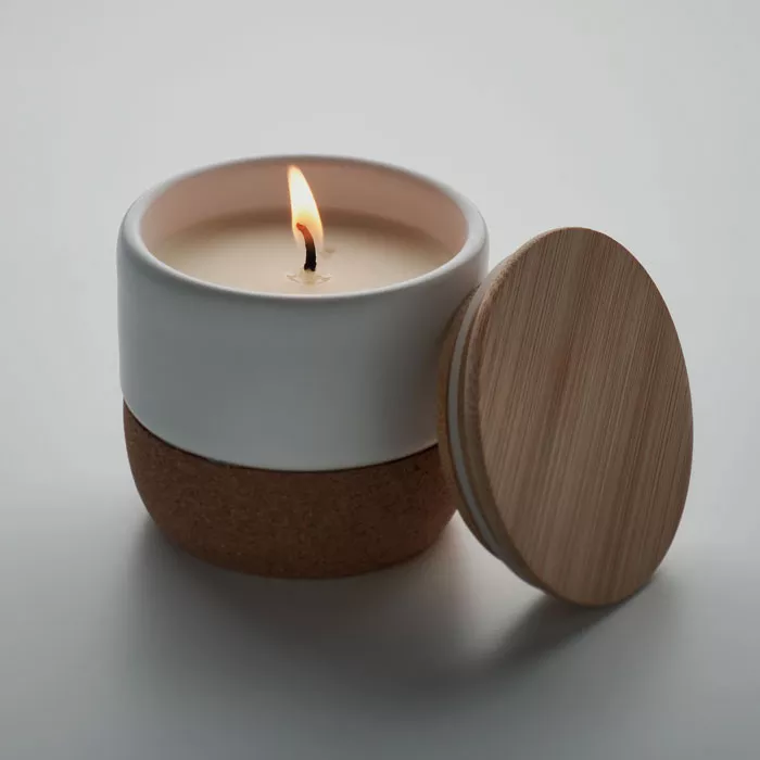 Восковая свеча на растительной основе с ароматом свежего льна в керамогранитной баночке с бамбуковой крышкой и пробковым основанием. 80 гр. Время горения: 7,5 часов.