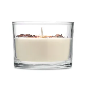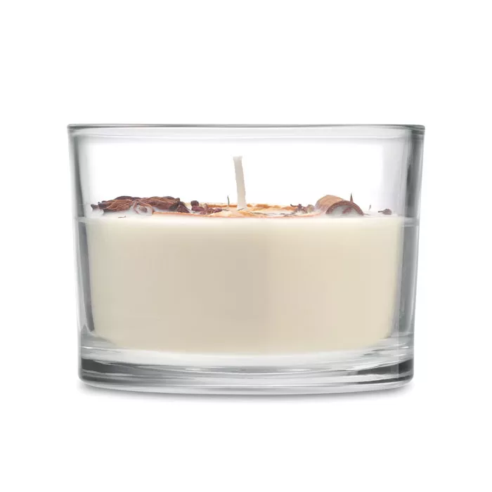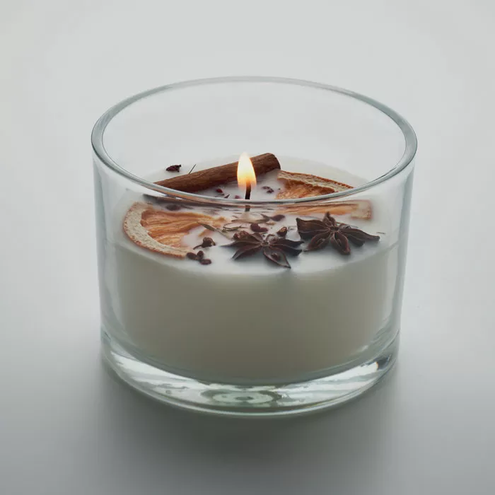 Восковая свеча с ароматом корицы и цитрусовых на растительной основе с засушенными цветами и фруктами в стеклянном стаканчике. 300 гр. Время горения: 50 часов.