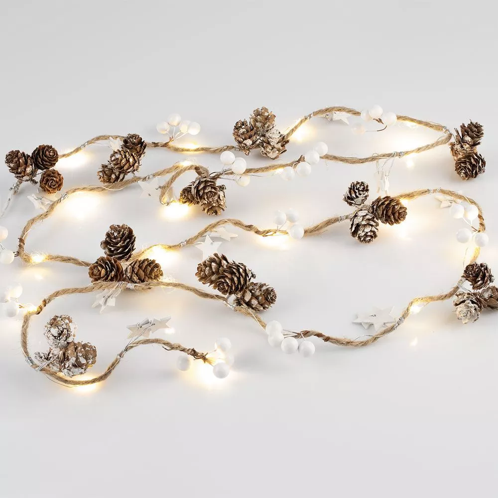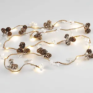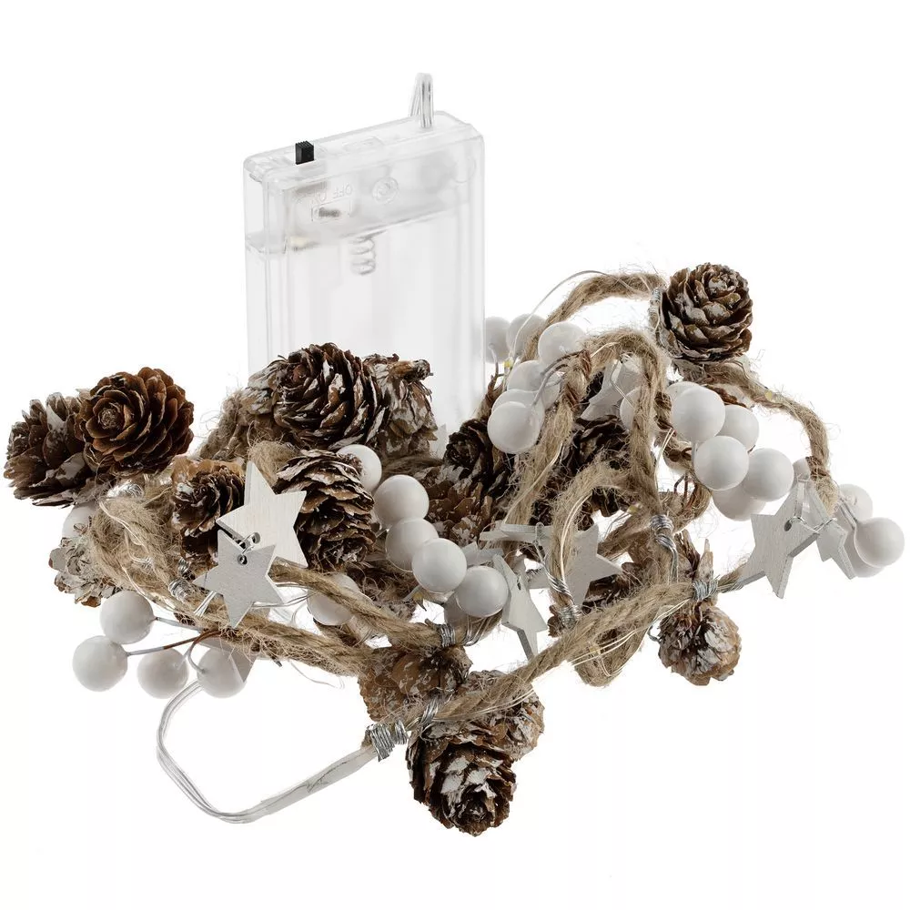 Шишки, бусины, звездочки и 20 лампочек с теплым светом. Работает от 3 батареек АА (в комплект не входят).