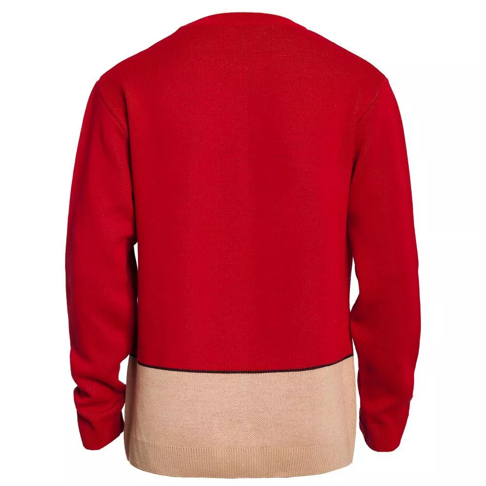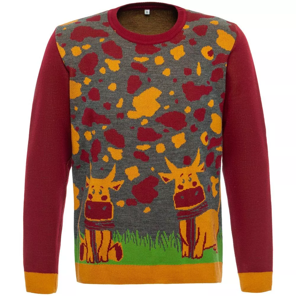 Свитер с вывязанным логотипом и индивидуальным рисунком в фирменной цветовой гамме.
