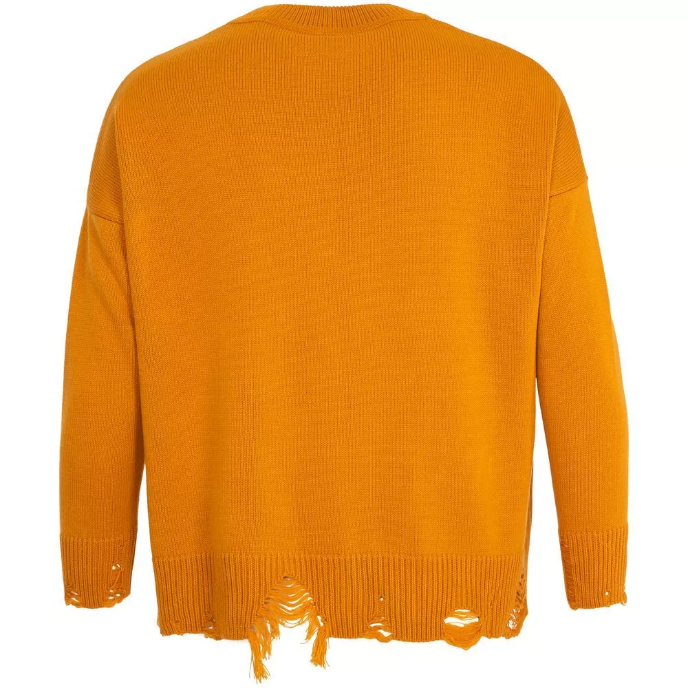 Модель: однотонный гладкий свитер унисекс, спущенное плечо. Ворот, манжеты и низ изделия вывязаны резинкой c добавлением эффекта «рваного» края.