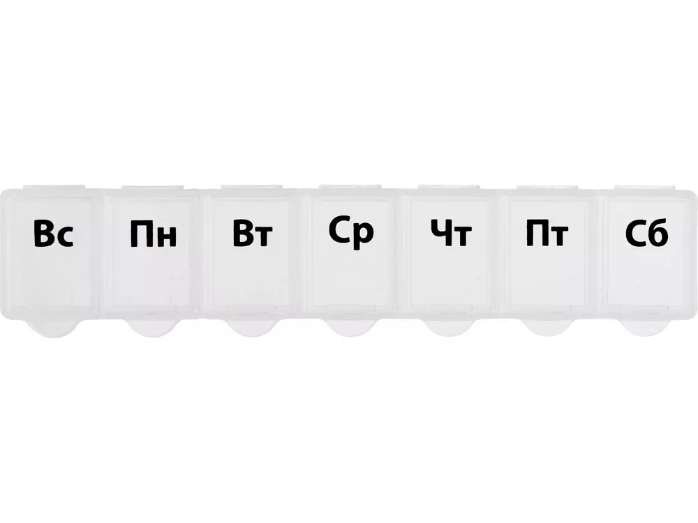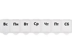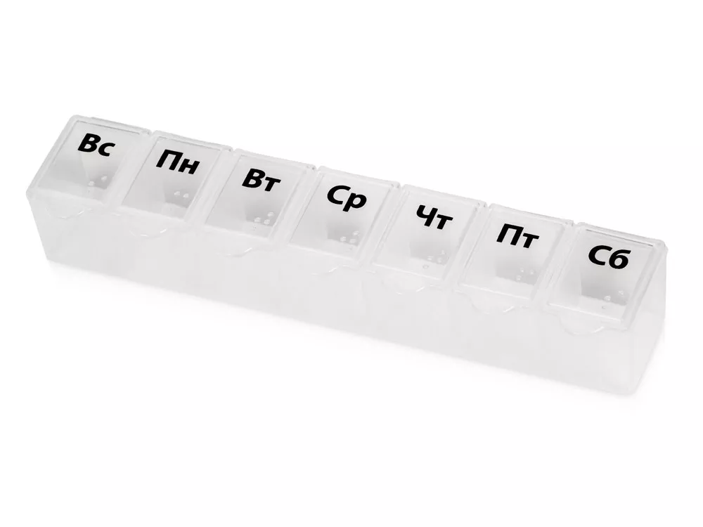 Таблетница с днями недели. Надписи продублированы шрифтом Брайля на английском языке. Каждый отсек оснащен крышкой с защелкой – содержимое не вывалится при тряске в машине или в сумке. Вы можете разместить на таблетнице свой логотип или другое изображение. Преимущества: · надежность хранения · отсеки подписаны по дням недели · удобно брать с собой в поездки Тампопечать (1 цвет (цветные изделия)) на данный товар осуществляется бесплатно. Оплачивается только настройка оборудования в размере 3600 рублей на весь тираж.