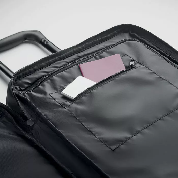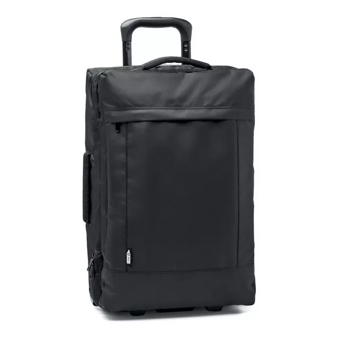 Тележка из полиэстера 600D RPET с мягкими боками. Два больших внутренних отделения на молнии. Один передний карман на молнии, боковая и верхняя ручки. Комбинированный замок и двойная рама. 2 колеса.