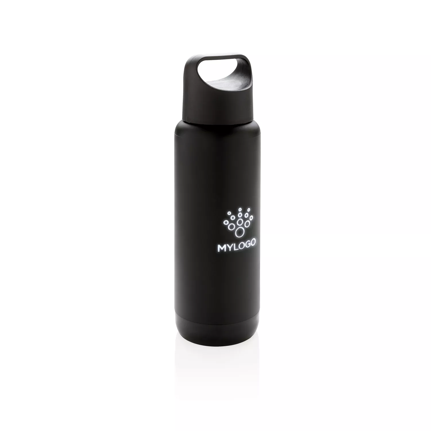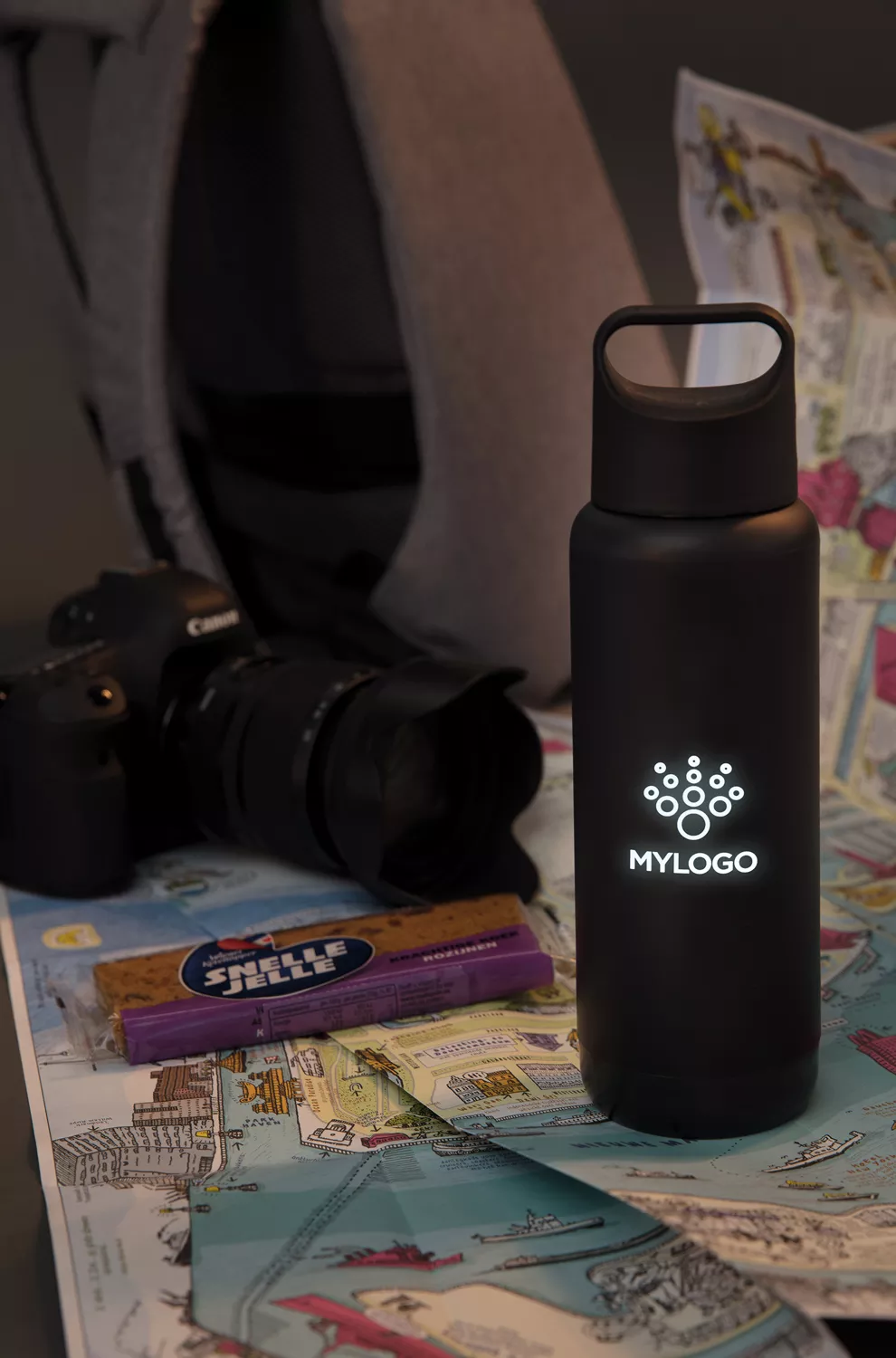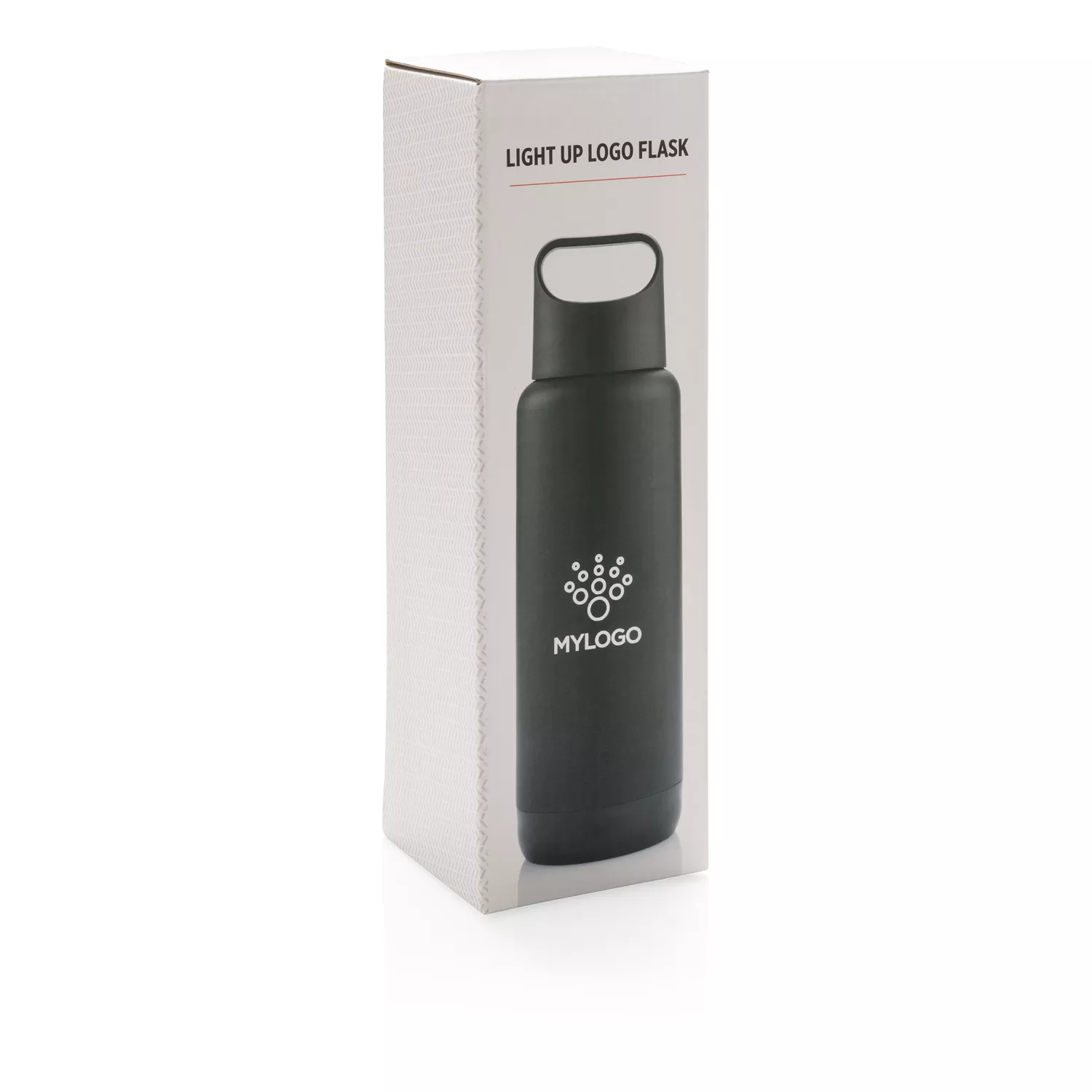 Термос с двойными стенками. Внутренняя стенка выполнена из нержавеющей стали марки 304, внешняя – из прочного пластика ABS. Функция подсветки логотипа с помощью лазерной гравировки. В комплекте 2 батарейки типа CR2032. Объем 500 мл.