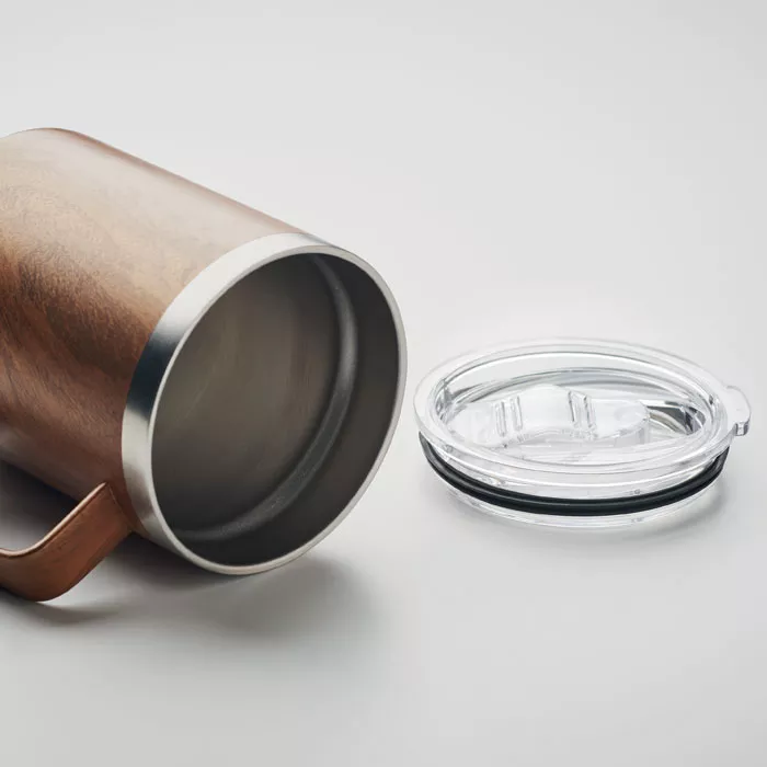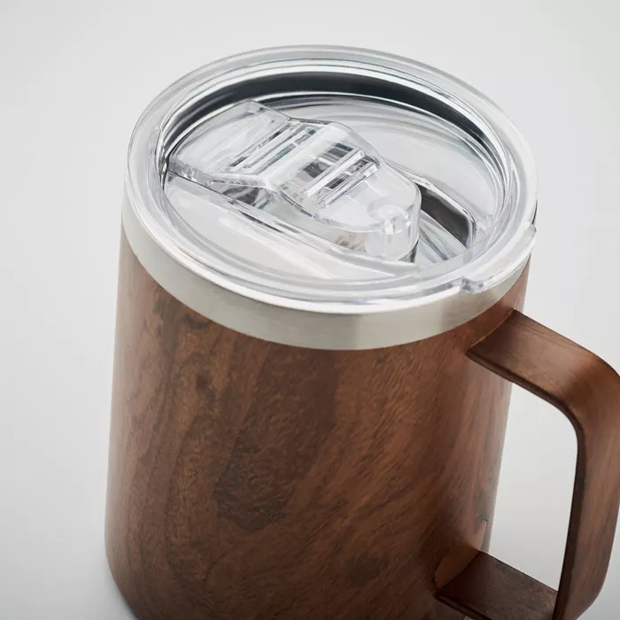 Термокружка с двойными стенками из переработанной нержавеющей стали (90% переработанной нержавеющей стали и 10% нержавеющей стали) с деревянным покрытием и крышкой с отверстием для питья. Объем 300 мл.