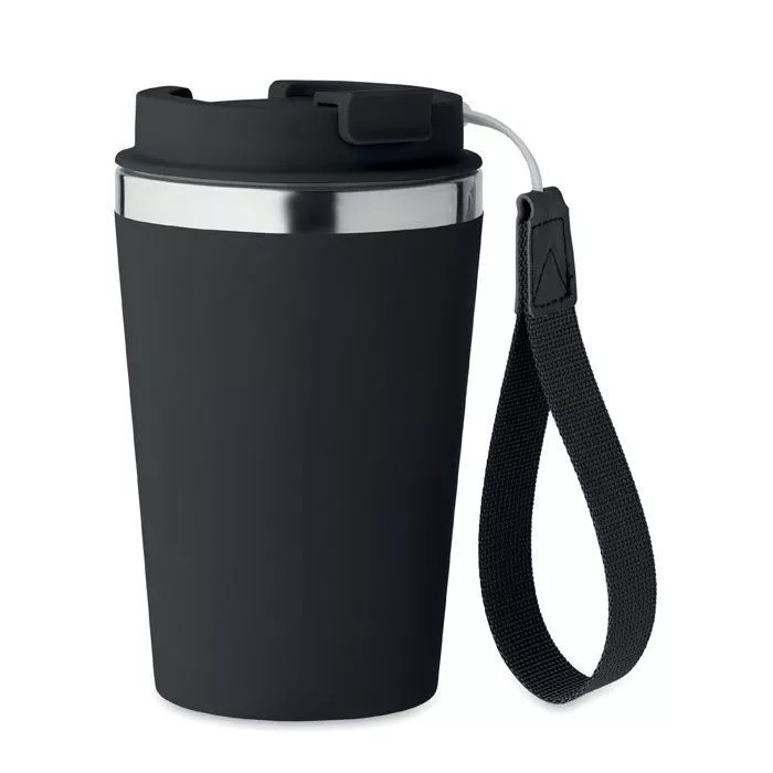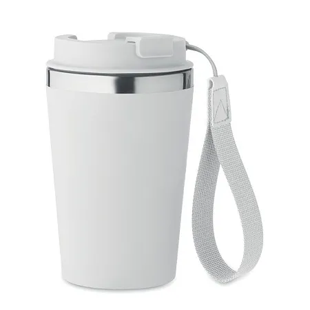 Термокружка с двойными стенками из переработанной нержавеющей стали (90%) и обычной нержавеющей стали (10%) с внешним покрытием из переработанного полипропилена с ремешком для запястья из RPET. Объем: 350 мл. Герметична.
