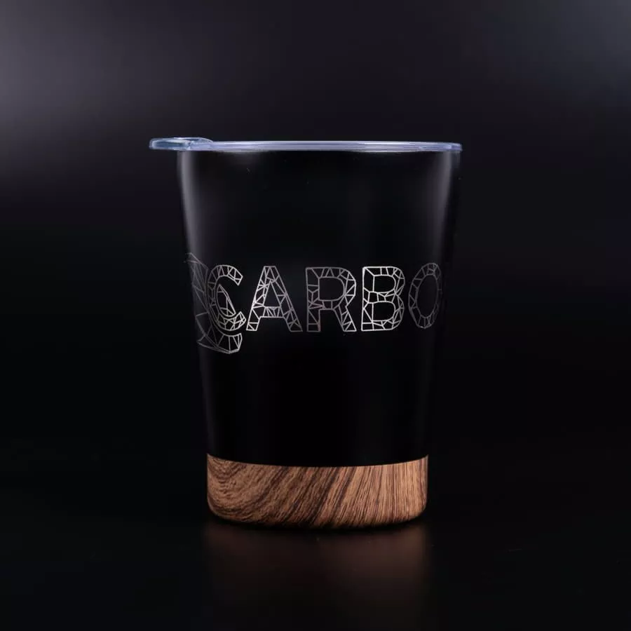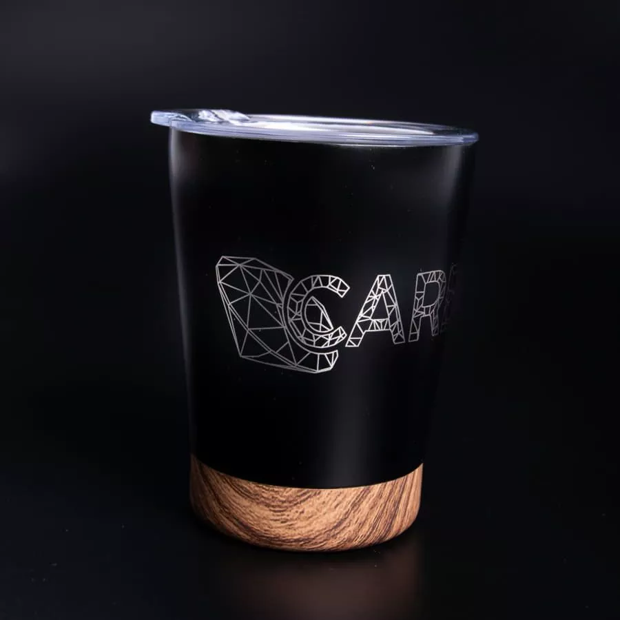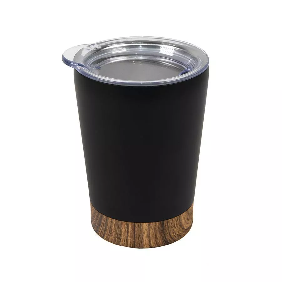 Стильная термокружка с черным матовым корпусом и декоративной вставкой с имитацией фактуры дерева soft-touch. Двойные стенки из стали сохранят напиток горячим до 3х часов. Высота без крышки 11,4 см, подходит для большинства кофемашин.