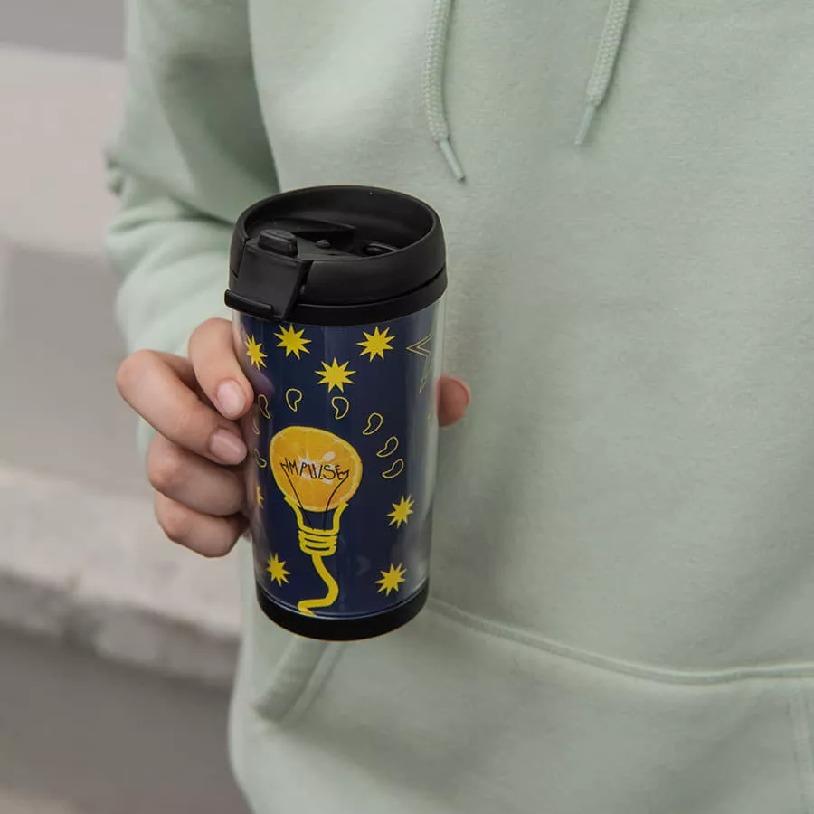 Термокружка Impulse (герметичная) под полиграфическую вставку. Двойные пластиковые стенки сохранят напиток теплым в течение 2-3 часов. Высота без крышки 13,3 см, подходит для большинства кофемашин. Внутренняя колба выполнена из PP-пластика, внешняя - из PS-пластика. Перерабатываются на территории России. BPA-free (не содержит бисфенол А).