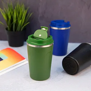 Термокружка с двойными стенками с откидным клапаном для питьяКолба и корпус из нержавеющей стали.Матовая микрорельефная фактура корпуса достигается благодаря особому покрытию - powder coatingЭто специальное порошковое окрашивание, более прочное и долговечное Сохраняет температуру напитков до 3-4 часов.Индивидуальная упаковка - коробка из крафтового картона