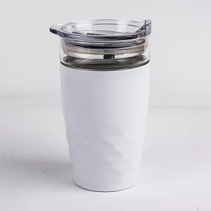 Это необычная вакуумная термокружка для офиса. Внутри - стеклянный стакан, который сохраняет вкус напитка, но не впитывает запахи. Снаружи - стальной стакан с двойными стенками, который помогает поддерживать температуру горячих напитков 2 часа, холодных - 5 часов. При необходимости можно использовать без стеклянной части - стальной вакуумный стакан с крышкой. В таком случае температура горячих напитков сохранится до 6 часов, холодных - до 8 часов. Прозрачная крышка из высококачественного пластика - тритан. Легко мыть, благодаря разборной конструкции.