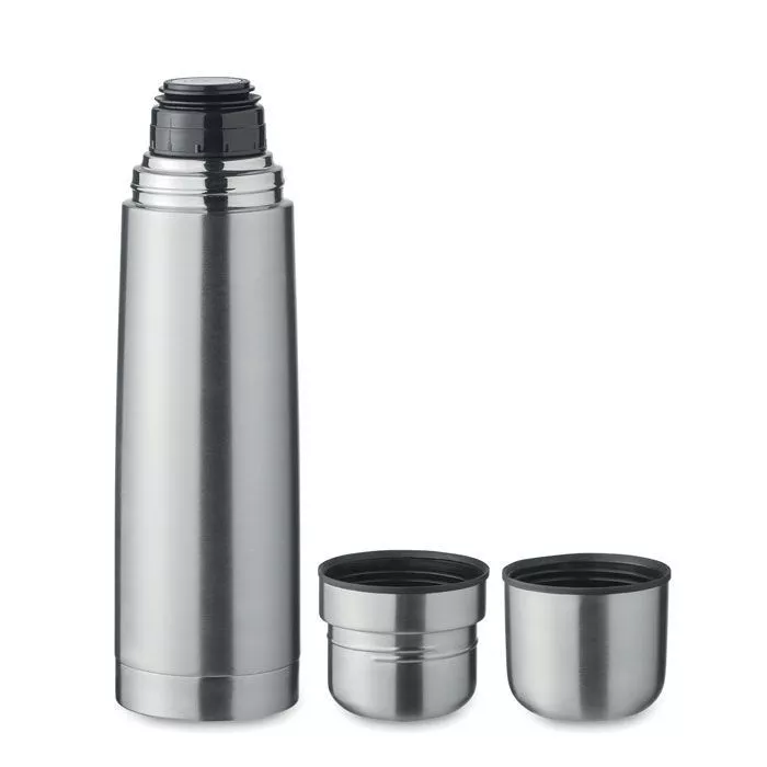 Термос с двойными стенками из переработанной нержавеющей стали 90% и 10% нержавеющей стали, с 2 встроенными в крышку стаканами (внутренняя стенка из полипропилена). Объем фляги: 750 мл, внешний стакан: 150 мл, внутренний стакан: 125 мл.