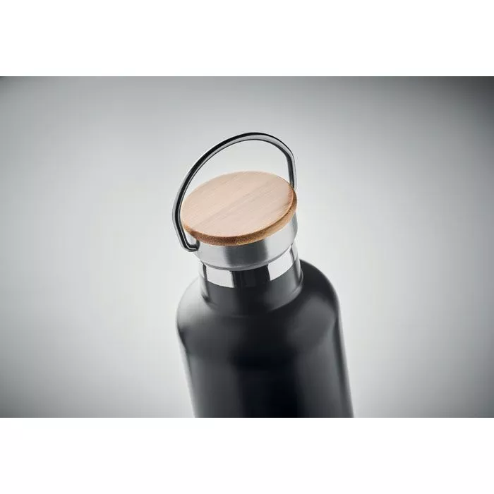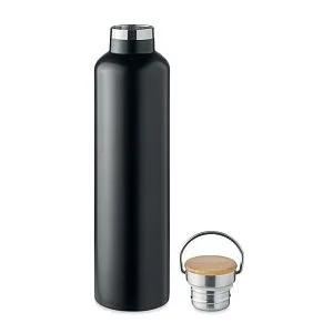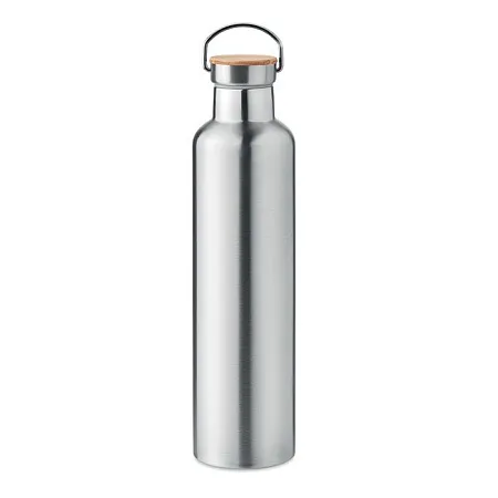 Термос с вакуумной колбой из нержавеющей стали с двойными стенками, бамбуковой крышкой и ручкой для переноски. Объем: 1 л.