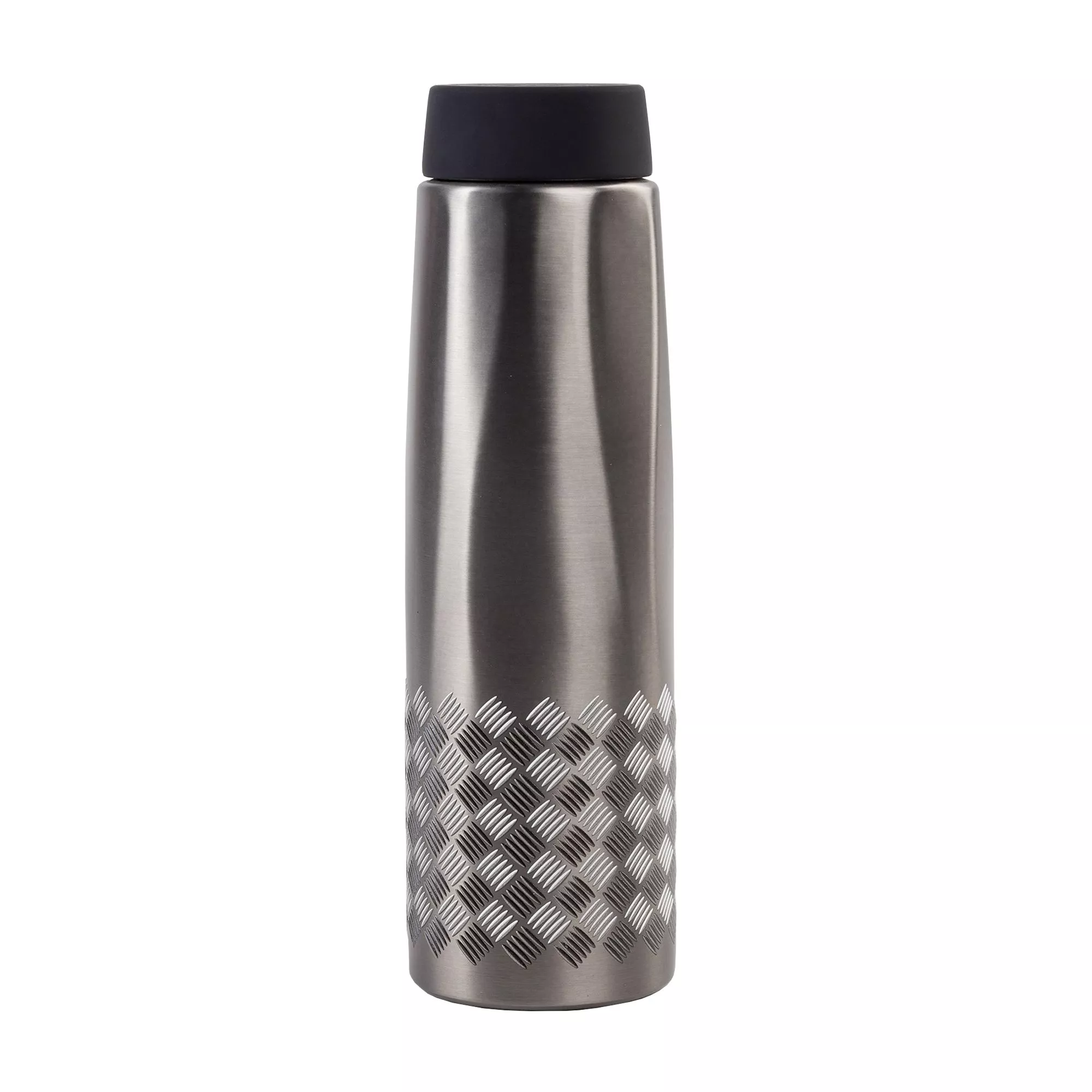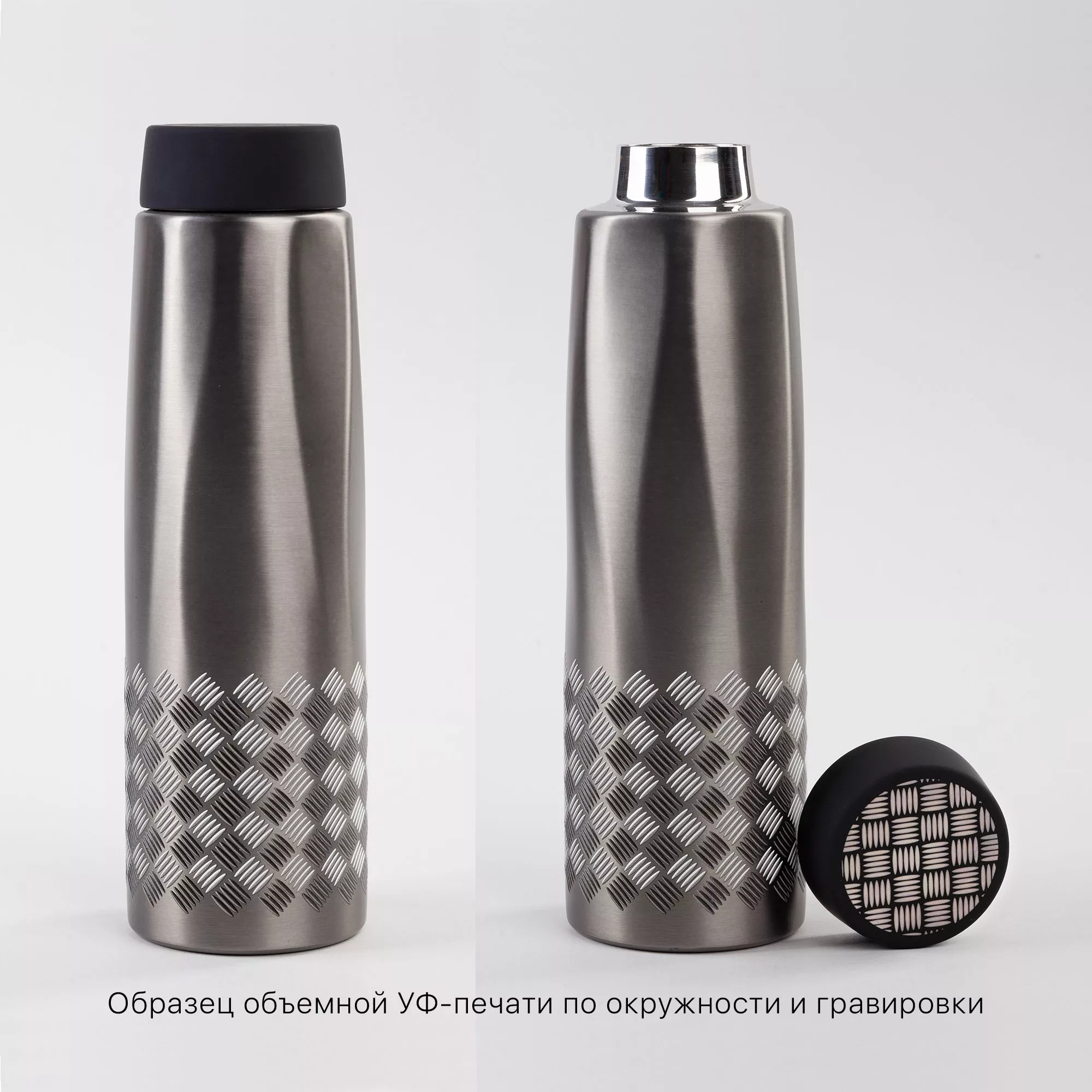 Образец термоса "CALYPSO" с объемной уф-печатью по окружности и гравировкой на крышке. Рисунок "Квинтет" передает фактуру рифленого металла, тактильный и геометричный, отлично смотрится на темно-сером корпусе. На образцы с нанесением действуют специальные условия, для уточнения скидки необходима авторизация.