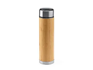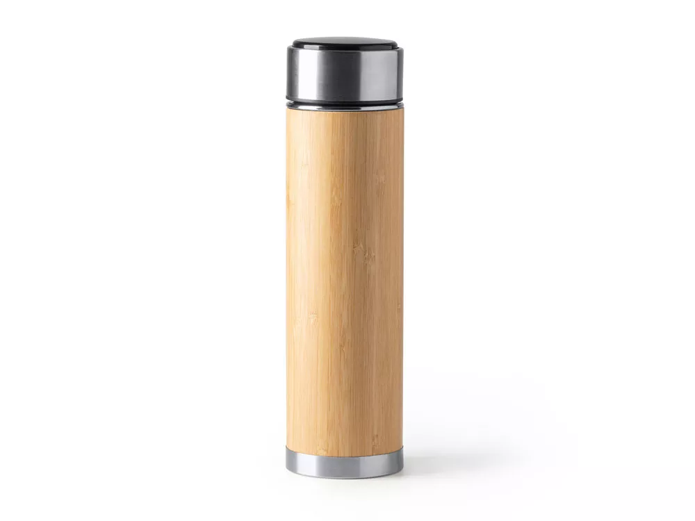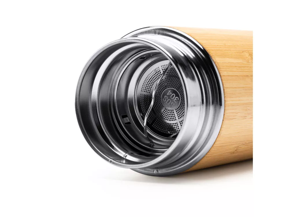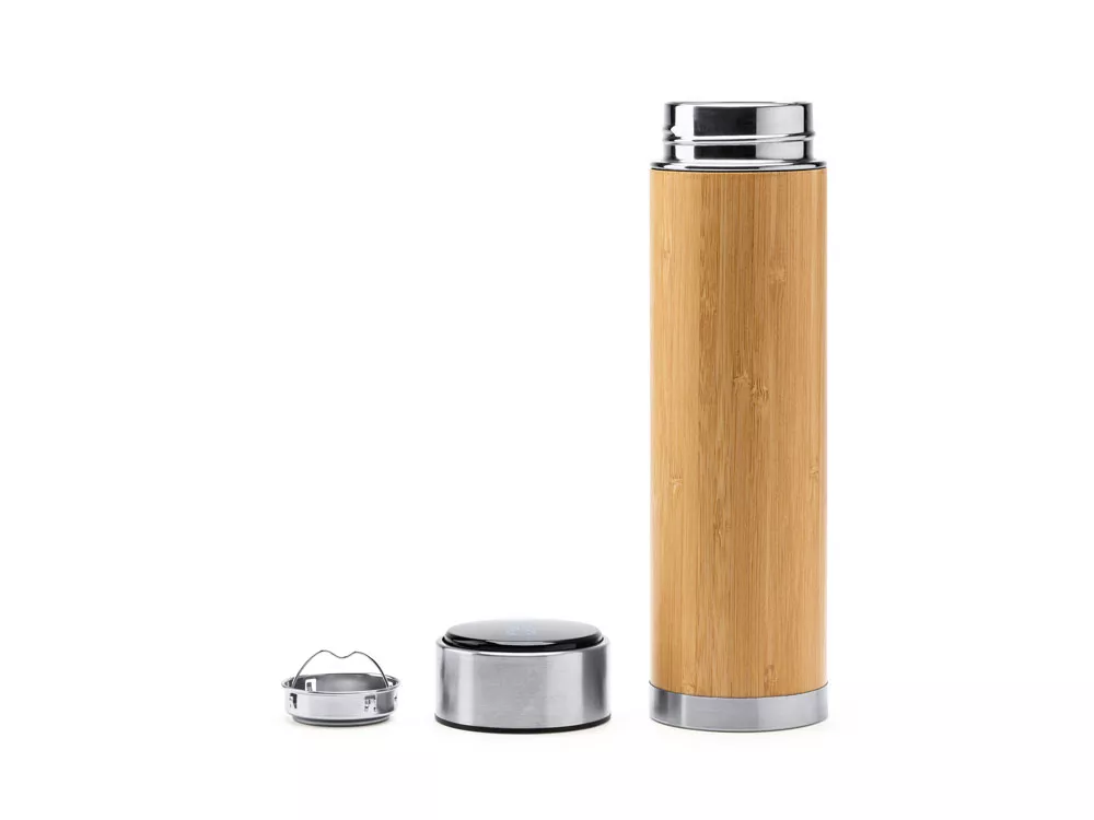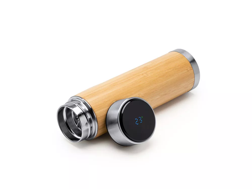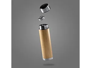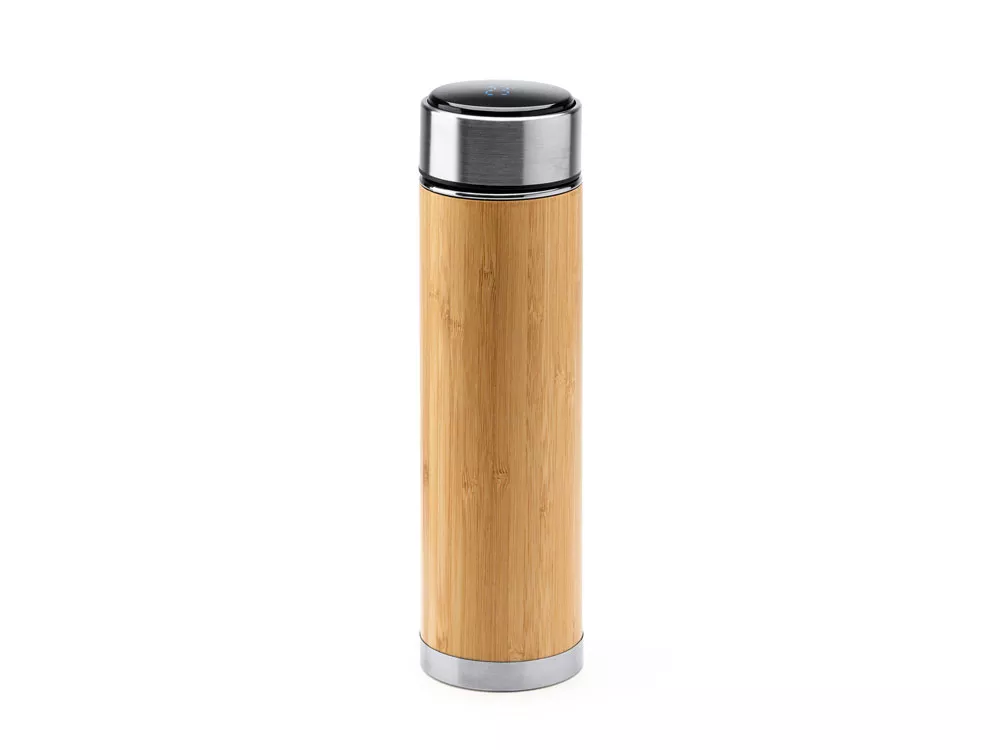 Термос с двойными стенками из нержавеющей стали 304 и бамбука с заварочным устройством. Цифровой сенсорный термометр на крышке, чтобы узнать температуру вашего напитка. Объем 480 мл.