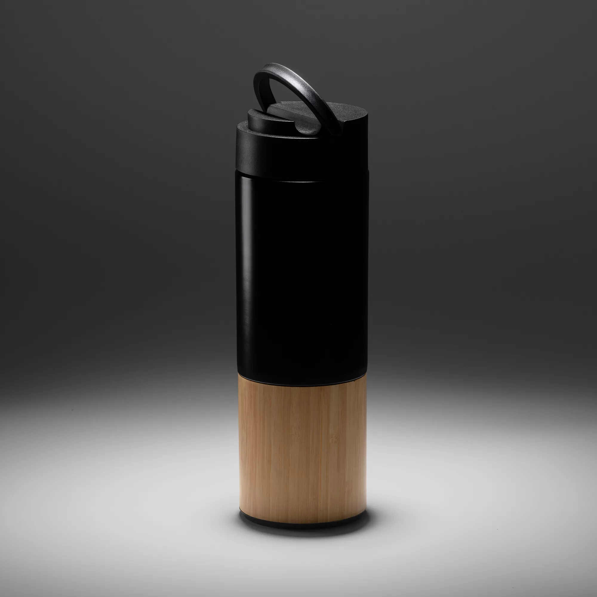 Бутылка с двойными стенками из нержавеющей стали и деталями из бамбука. Идеальная бутылка для сохранения напитков холодными и горячими. Крышка с функцией поддержки ручки, идеально подходит для смартфона. Емкость 450 мл.