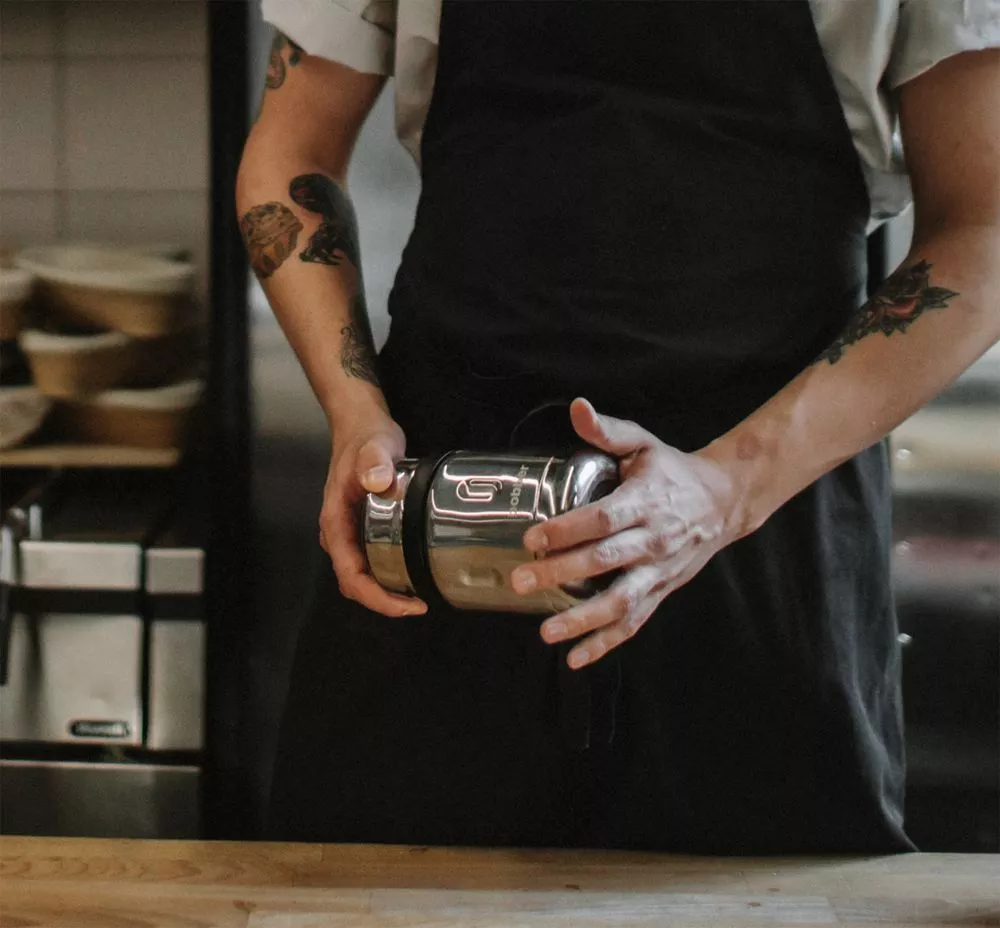 Стальной вакуумный термос для еды со складной ложкой. В нем любимые блюда не соприкасаются с пластиком и остаются горячими надолго.