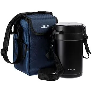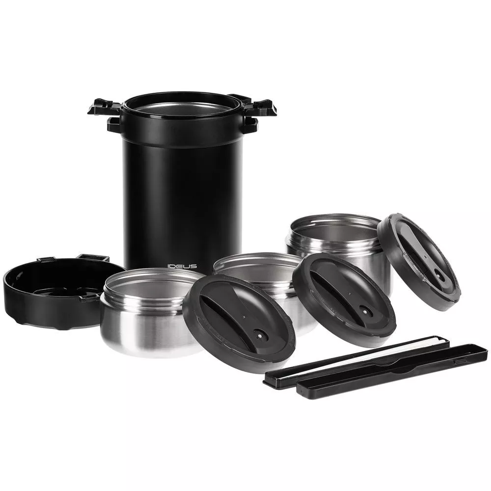- Внутри термоса: три контейнера из стали с крышками из пластика: один 730 мл и два по 550 мл