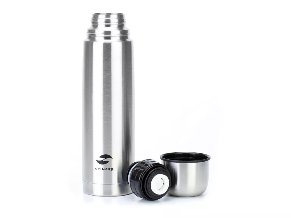 ТЕРМОС STINGER, 1 Л СВОЙСТВА: Тип термоса: для горячих и холодных напитков Материал корпуса: двухслойная нержавеющая пищевая сталь 18/8 Материал колбы: нержавеющая сталь Тип горлышка: узкое Тип крышки: закручивающаяся, с кнопкой подачи / блокировки воды Материал крышки: нержавеющая сталь и пластик без бисфенола А (BPA free) Объём термоса: 1 л Размер термоса: 86 х 86 х 314 мм Вес: 535 г Цвет: серебристый ХАРАКТЕРИСТИКИ: Сохраняет температуру: Горячий напиток: через 6 часов температура наполняемой жидкости 84,1℃ Холодный напиток: через 6 часов температура наполняемой жидкости 5,4 ℃ ОСОБЕННОСТИ: В комплекте: чехол из искусственной кожи чёрного цвета