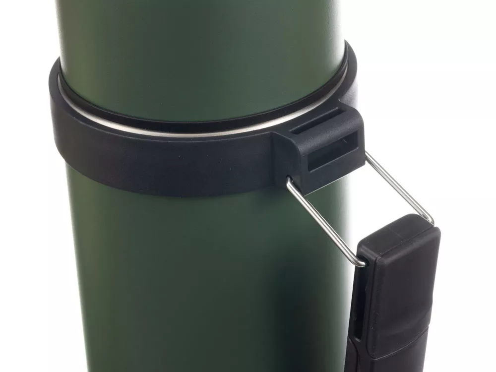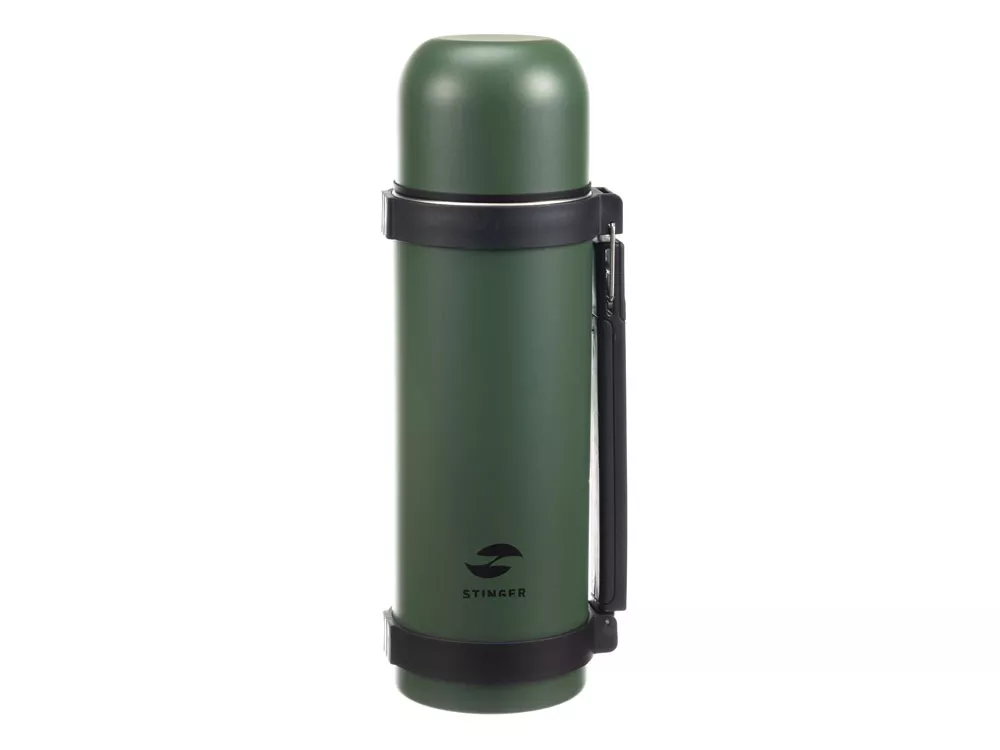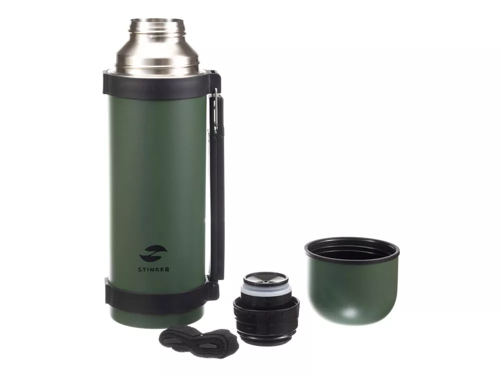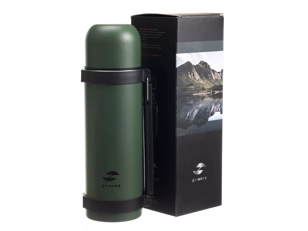 ТЕРМОC С РУЧКОЙ STINGER 1,2 л НАЗНАЧЕНИЕ Термос STINGER предназначен для употребления пищевых жидкостей (воды, напитков) как в горячем, так и в холодном состоянии. ХАРАКТЕРИСТИКИ Объём: 1,2 л Вес: 0,797 кг Время сохранения тепла: 24 часа Время сохранения холода: 24 часа Метод изоляции: вакуум Размеры • Высота – 31,8 см • Диаметр горлышка – 7,5 см • Диаметр дна – 10,2 см • Ширина (с учетом ручки) – 12,4 см Тип крышки: винтовая Тип пробки: винтовая крышка-пробка с кнопкой Тип горлышка: широкое Тип подачи наполнения: кнопка подачи/блокировки воды Цвет: зеленый Материалы • Корпус: нержавеющая сталь, класс AISI 304 18/8 Stainless Steel • Колба: нержавеющая сталь, класс AISI 304 18/8Stainless Steel • Крышка: нержавеющая сталь, класс AISI 304 18/8Stainless Steel, пищевой пластик, не содержит бисфенол А (BPA free) • Прокладки-уплотнители: пищевой силикон ОСОБЕННОСТИ • Двойные стенки с вакуумной изоляцией отлично сохраняют температуру долгое время, гарантируют безопасность прикосновения к очень горячим и холодным напиткам. • Внешний и внутренний корпус из прочной пищевой нержавеющей стали AISI 304 18/8. • Пластиковые детали не содержат Бисфенол А (BPA FREE). • Герметичная крышка-пробка надежно защищает от случайного открывания и проливания жидкости. • Эргономичная ручка и съемный регулируемый ремень для удобной переноски. • Идеально сохраняет вкус и аромат любимых напитков.