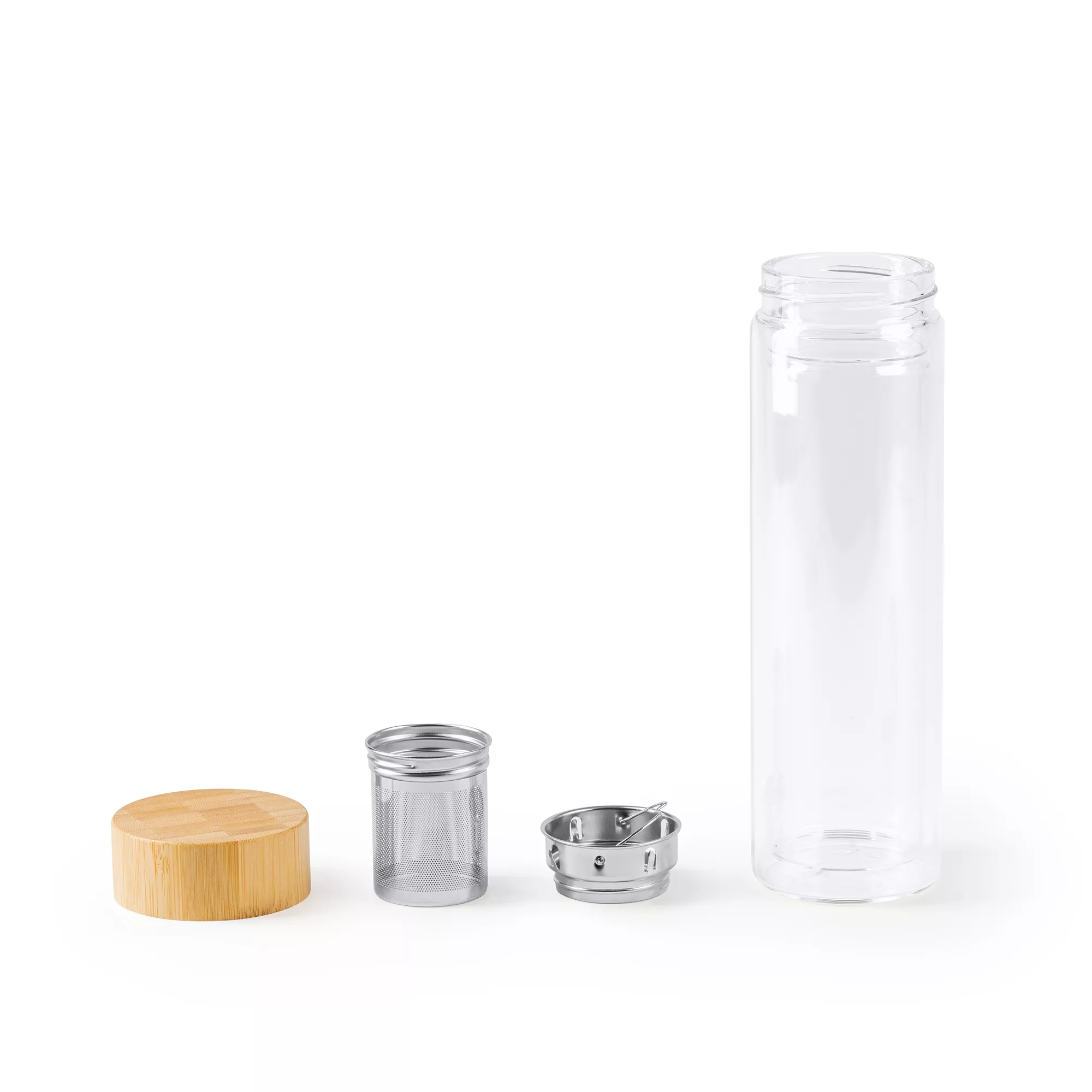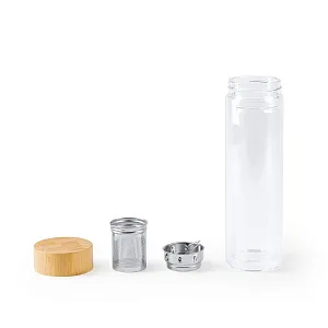 Бутылка из боросиликатного стекла с двойными стенками и бамбуковой крышкой. В комплект входит заварник для чая, поэтому его можно пить где угодно. Емкость 420 мл.