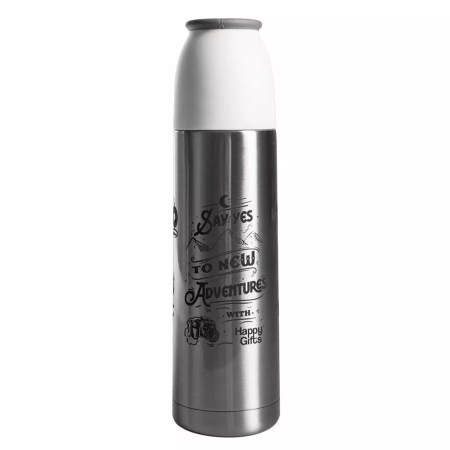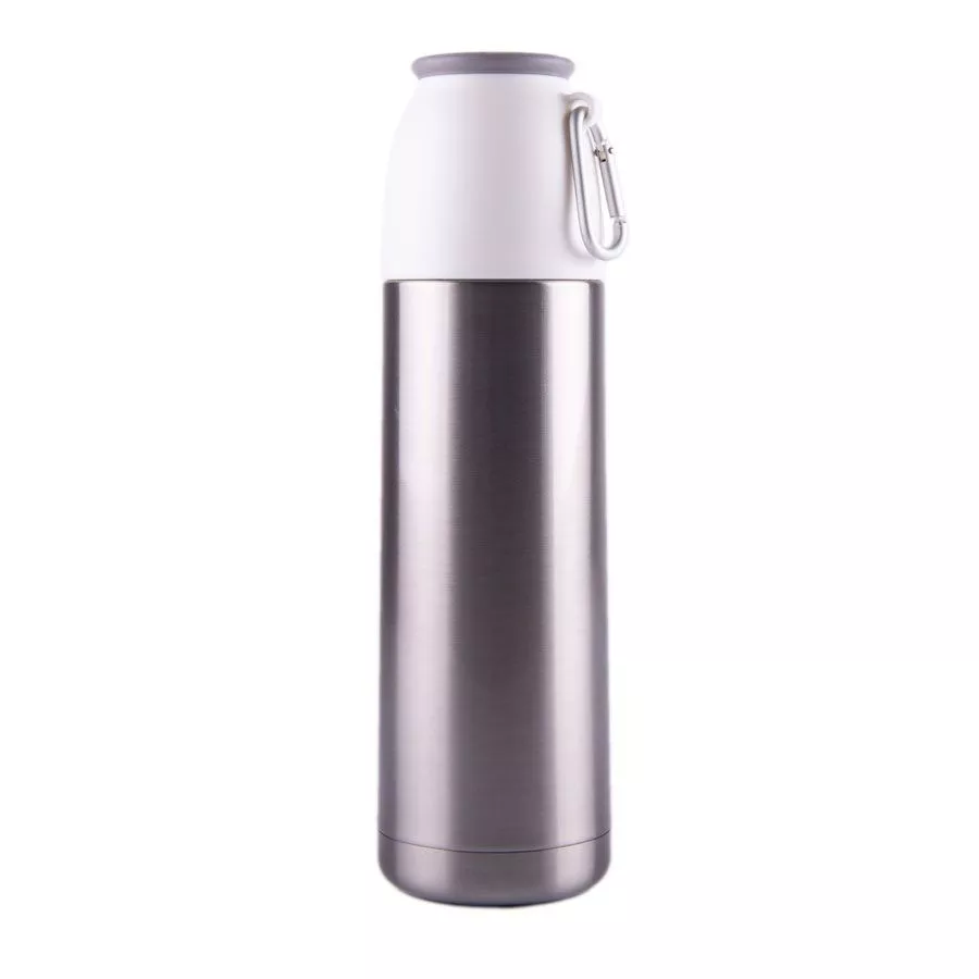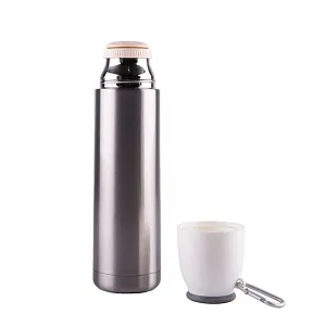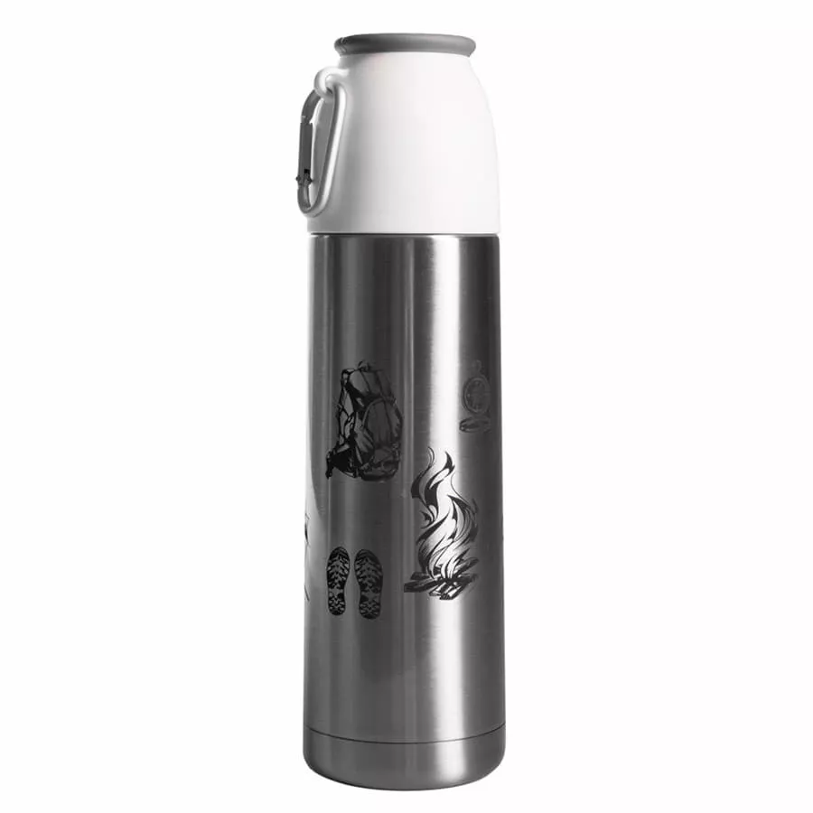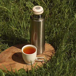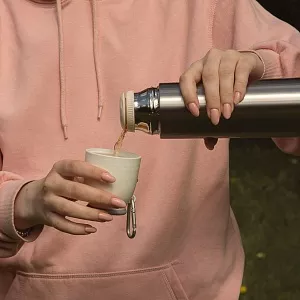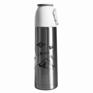 Вакуумный термос Escape с двойными стальными стенками. Браслет не входит в указанную стоимость и продается отдельно. Артикул 40001. На крышке термоса – карабин. Удобно брать в поход, пристегнув к рюкзаку (не занимает место внутри рюкзака).