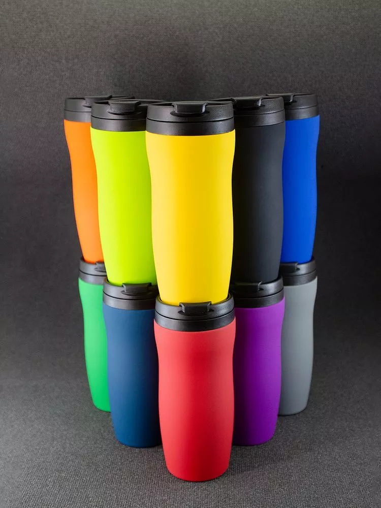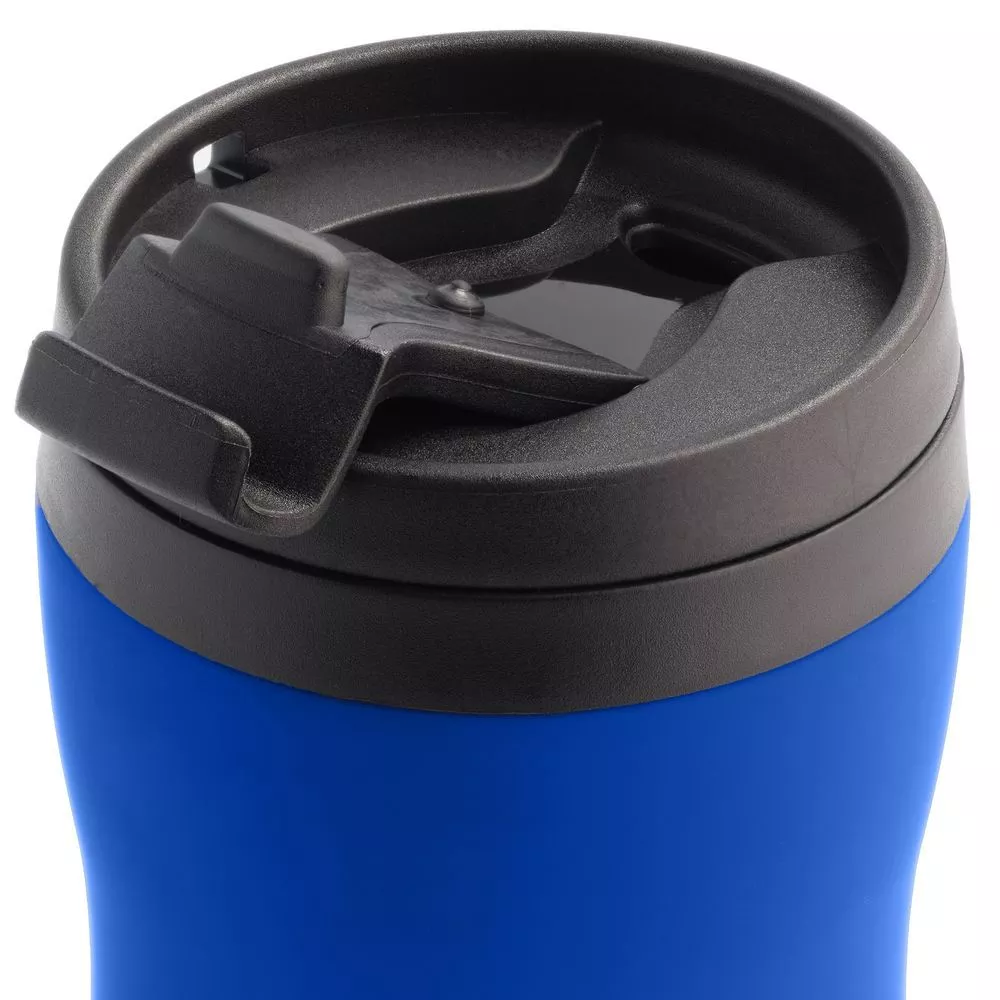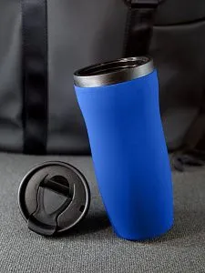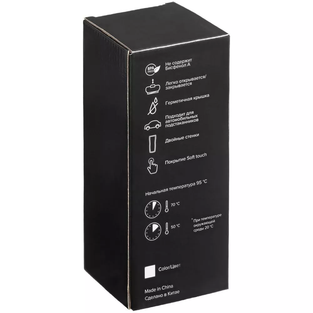Двухслойная конструкция из нержавеющей стали снаружи и пищевого пластика внутри. Герметичная завинчивающаяся крышка с откидным клапаном для питья. Покрытие софт-тач. В отверстие в крышке можно вставить шнурок для удобного ношения стакана на руке. Шнурок в комплект не входит.