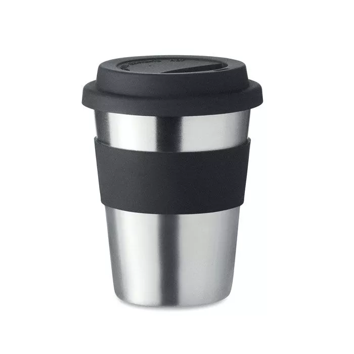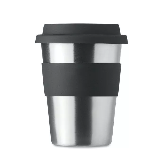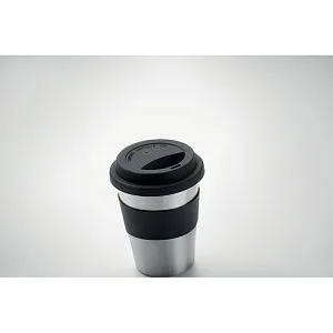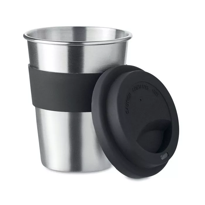 Стакан одностенчатый из нержавеющей стали с силиконовой крышкой и поясом. Емкость 350 мл. Поскольку это одностенчатая кружка, стакан может нагреваться.