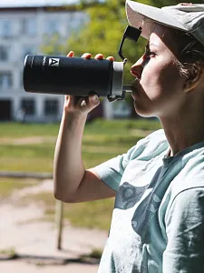 - Благодаря питьевой системе с носиком-поилкой термостакан легко открыть, нажав на кнопку, и пить во время движения