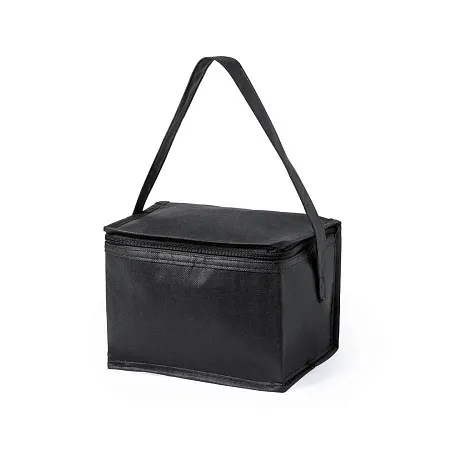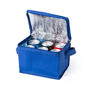 Сумка-холодильник на 6 банок из прочного нетканого материала. Внутри с алюминиевым покрытием. С застежкой-молнией и ручкой для переноски соответствующего цвета.