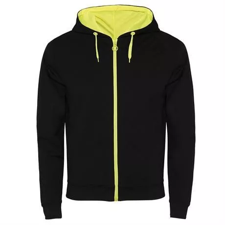 Толстовка из футера без начеса с деталями неонового цвета. Молния по центру с контрастным бегунком неонового цвета. Капюшон с контрастной неоновой подкладкой из микроперфорированного полиэстера, а также шнурком и металлическими люверсами. Длинные рукава.