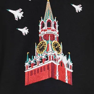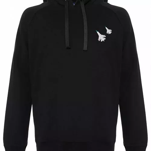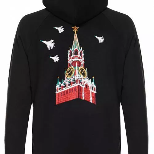 Черная толстовка с капюшоном на кулиске. Рукав реглан. Рельефная трикотажная резинка по низу рукавов и нижнему краю. Прорезные боковые карманы. Над Спасской башней: Полёты истребителей над центром Москвы — одно из самых ярких воспоминаний от парадов 9 Мая. Дизайнеры Gourji решили его запечатлеть в вышивке новых толстовок. На спине — Спасская башня во всей красе своих ярких цветов, а над ней — четыре белоснежных самолёта. На груди — рифма из двух истребителей, поменьше и побольше. Принимаем заказы на пошив толстовок в размерах от XS до XXL в цветах и дизайнах из ассортимента.ХАРАКТЕРИСТИКИ:Коллекция: Безусловные знакиМатериал: 70% хлопок / 30% полиэстерРазмер: M