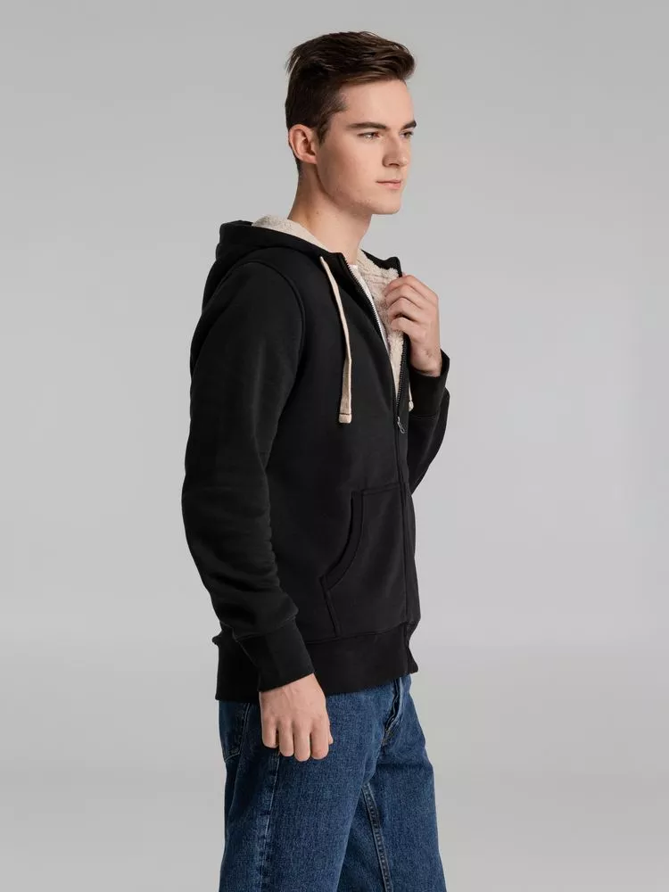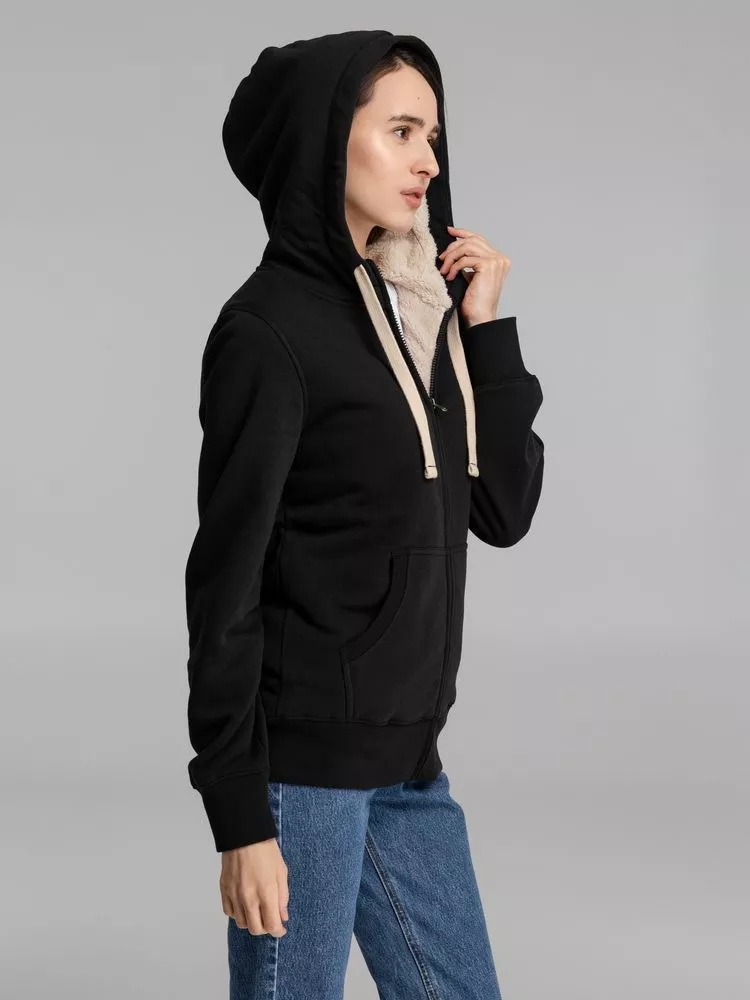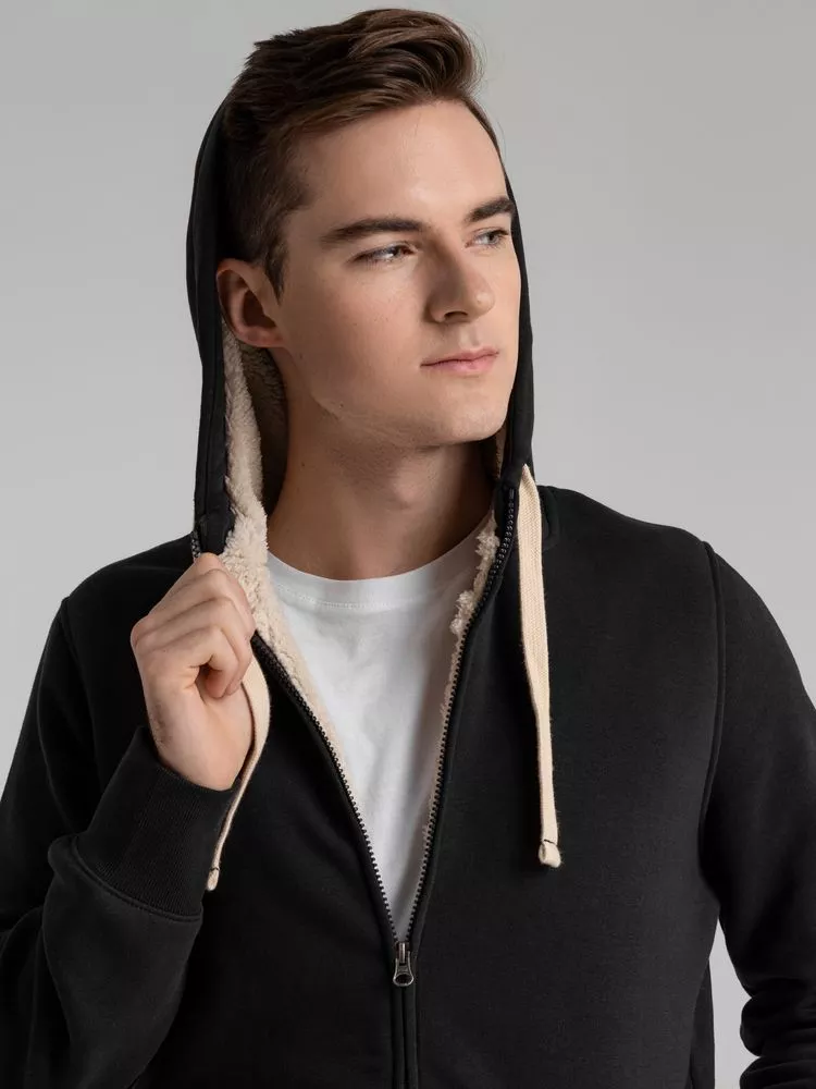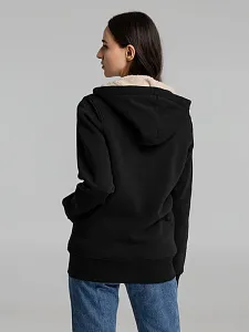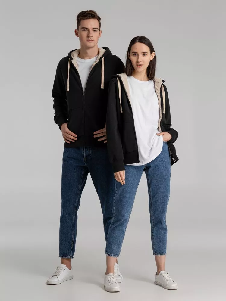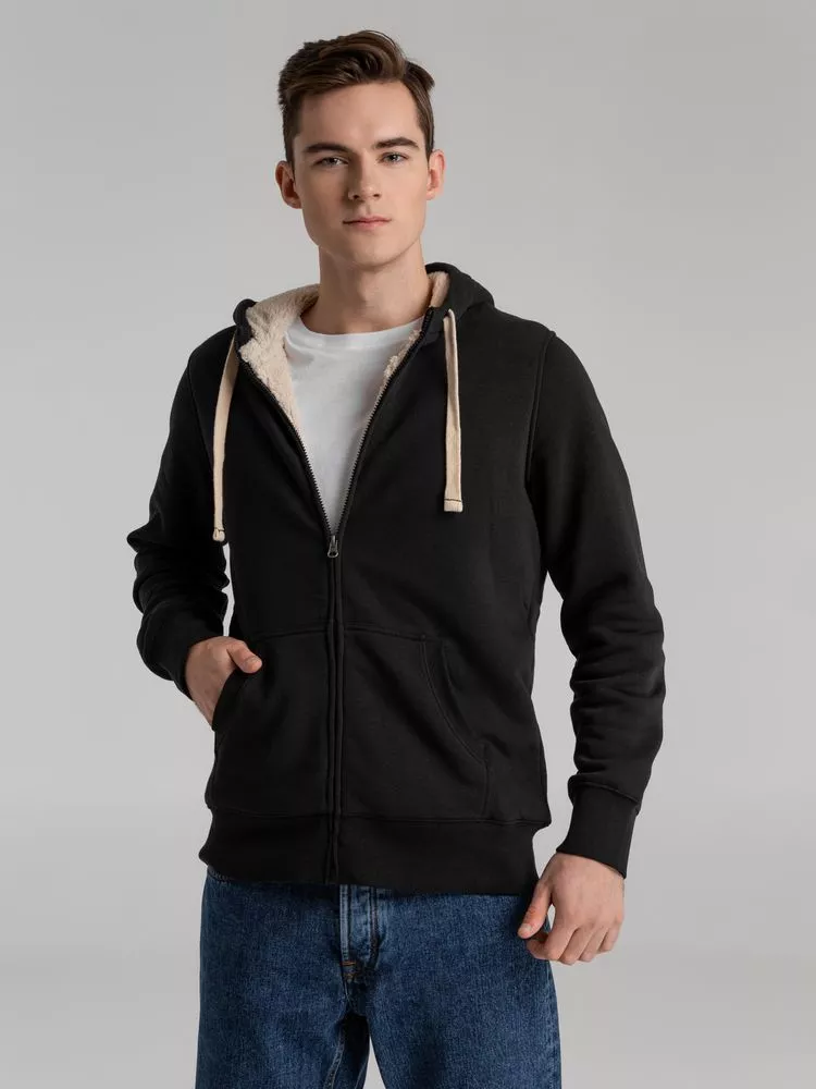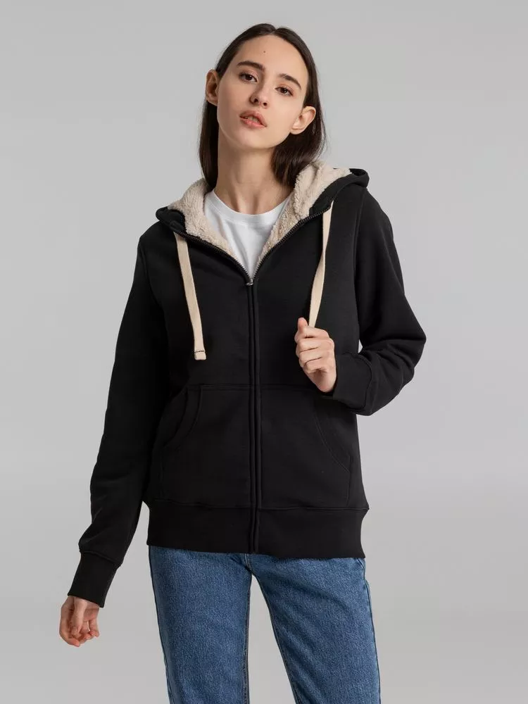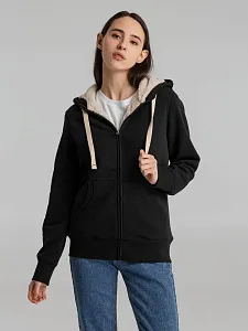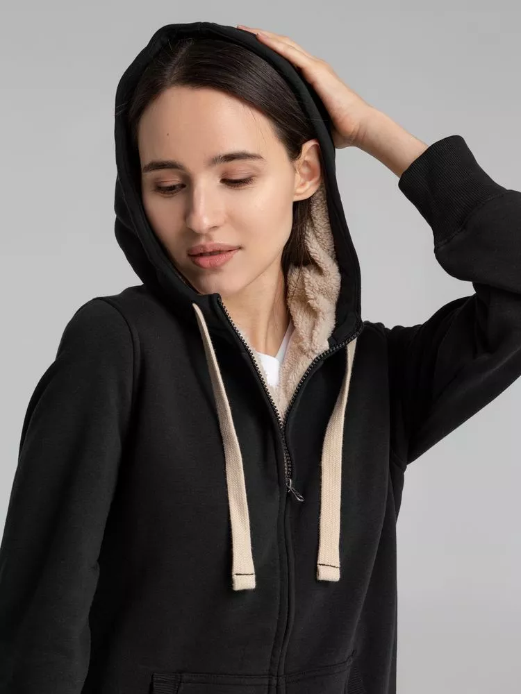Толстовка приталенного силуэта с карманом «кенгуру». Скрытая молния, широкий шнур контрастного цвета на капюшоне. Низ изделия и манжеты рукавов в резинку. Подкладка с пушистым ворсом.