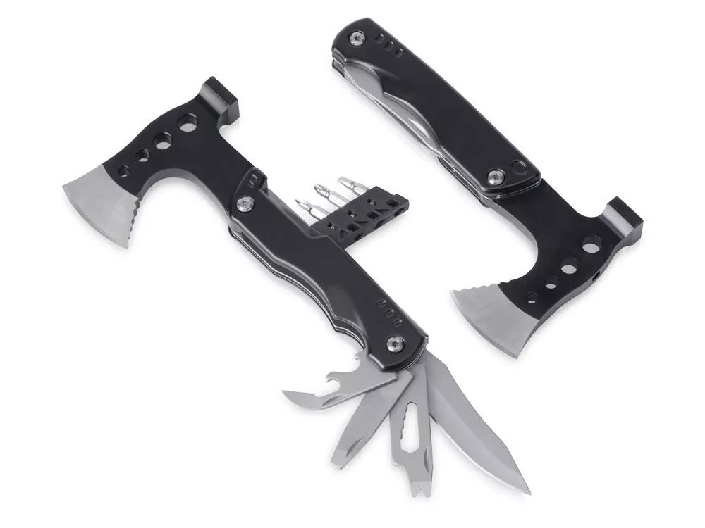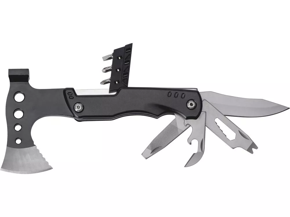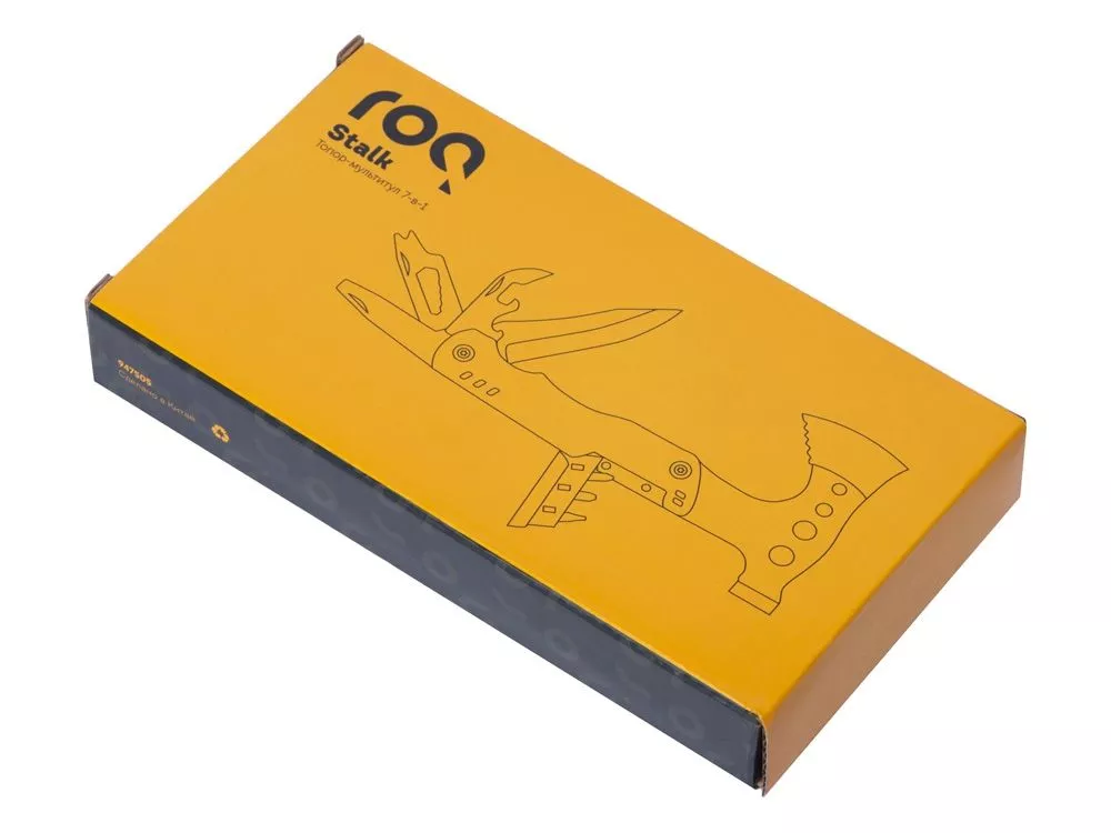 Топор-мультитул 7-в-1 Stalk бренда roq выполнен из нержавеющей стали 420 марки. Обладает значительным весом в 404 грамма для удобства работы топором или молотком. Товар поставляется в брендированном нейлоновом чехле с защитной накладкой на острие топора, что делает его транспортировку абсолютно безопасной. 1.Топор 2.Молоток 3.Сет отверток (плоская отвертка 5 мм, 2 крестообразные отвертки) 4.Нож 5.Шестигранник на 5 размеров (4/5/6/7/8 мм) 6.Напильники по металлу и дереву, плоская отвертка 7.Консервный нож и открывашка для бутылок Гравировка (оптоволоконный лазер) (Без чернения) на данный товар осуществляется бесплатно. Оплачивается только настройка оборудования в размере 1000 рублей на весь тираж.