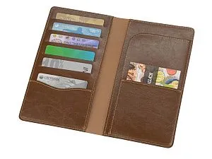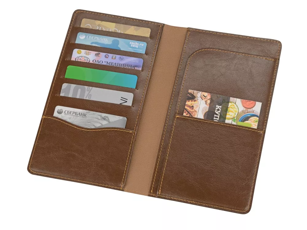 Стильный аксессуар для любителей путешествий, а также людей, часто бывающих в командировках. Трэвел-портмоне из приятной на ощупь натуральной кожи оснащен отделением для купюр и множеством кармашков под визитки или пластиковые карты.
