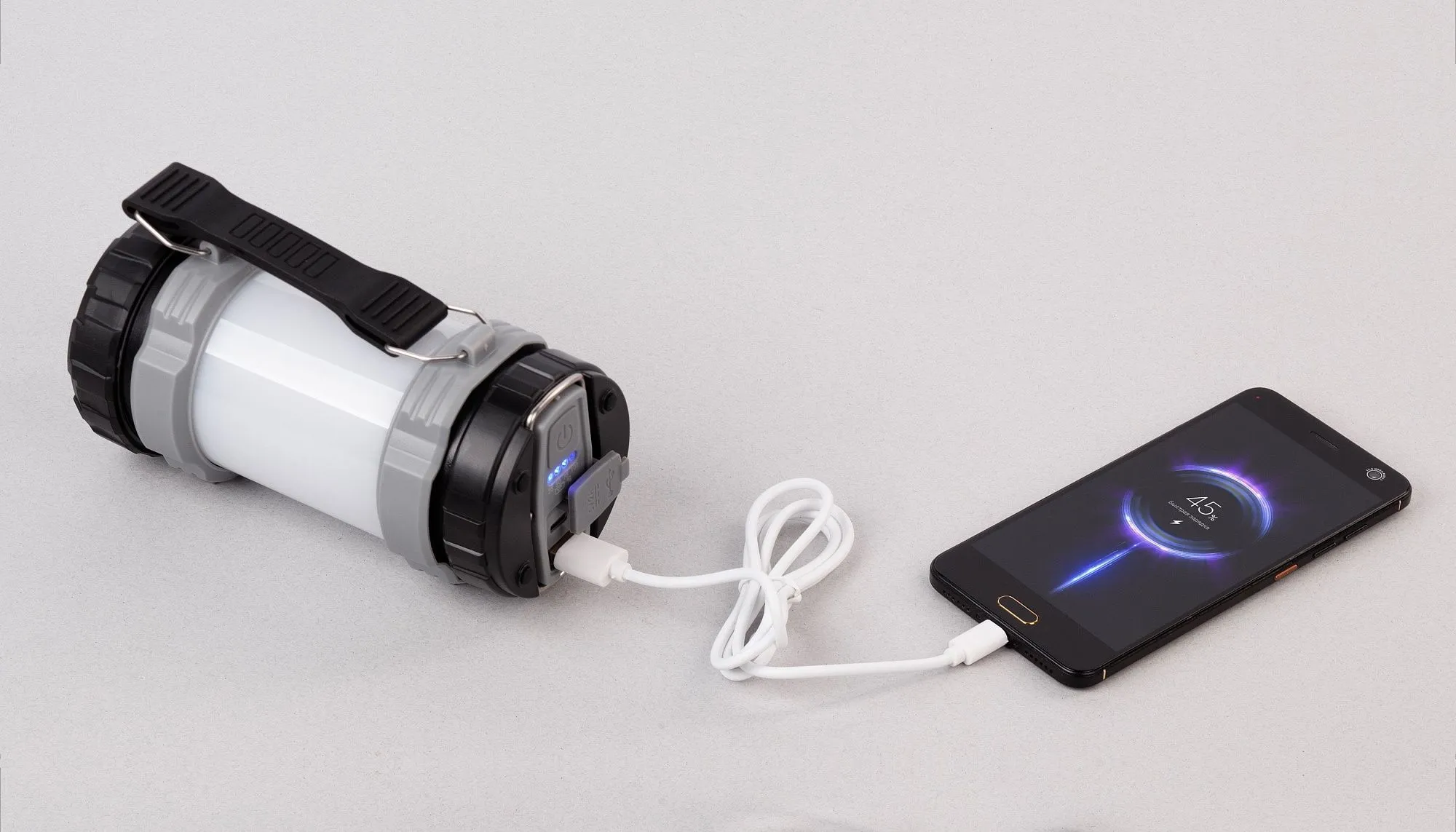 Туристический led-фонарь для активного отдыха со встроенным аккумулятором 4000 mAh, индикатор уровня заряда. Эргономичная форма, складная ручка, крючки-подвесы для использования в палатке, автомобиле, кемпинге.