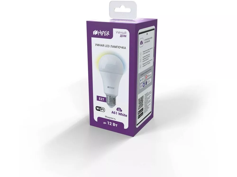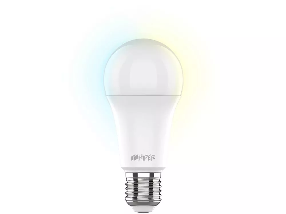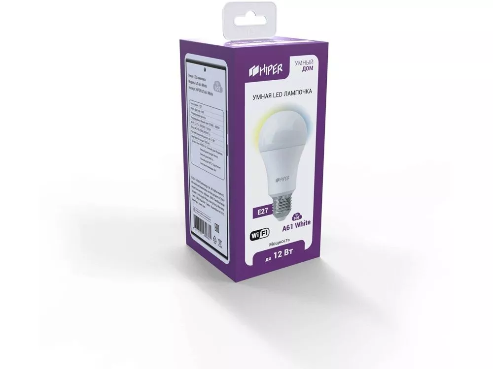 Умная LED лампочка Wi-Fi HIPER IoT A61 White - LED лампа, поддерживающая удаленное управление через приложение HIPER IoT. Предназначена для использования в уже установленных люстрах и светильниках, наделяя их дополнительными функционалом. • Дистанционное управление. • Поддержка голосовых помощников Яндекс Алиса и Google Home. • Поддержка сценариев умного дома. • Энергосберегающая технология и энергетический класс A+. Потребляемая мощность - 12 Вт, обеспечивает световой поток до 1020 lm, что эквивалентно лампочке накаливания мощностью - 100Вт. • Самый распространённый формат LED-ламп A60. Лампа может быть установлена в самый популярный патрон Е27. • Изменяемый белый свет. В приложении от HIPER возможно настроить температуру белого цвета в диапазоне 2700K - 6500K, выбрав теплый или холодный (дневной) свет. • Диммируемость лампы, позволяющая регулировать яркость света.